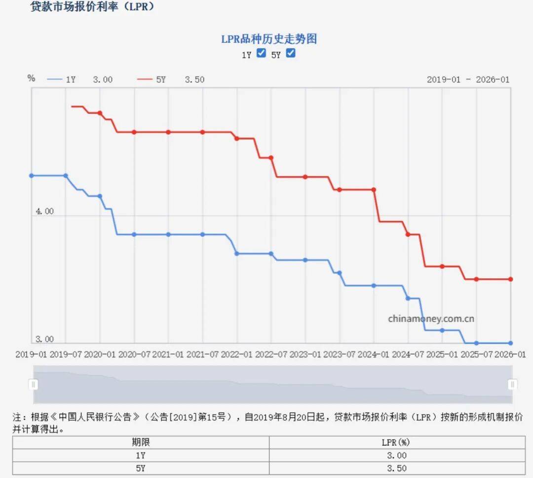 来源:市场资讯 (来源:上海楼市情报) 虽然中央经济工作会议表态"要继续实施适度宽松的货币政策",但降息不是唯一的手段,央行也能通过"短期+中期+长期"多种工具组合,让流动性管理更 科学、更精准。 虽说LPR降息无望,但在此前年内首次结构性"降息"已经落地。 降息"靴子",又没有落地。 就在刚刚,央行公布最新一期LPR,5年期以上为3.5%,1年期为3.0%,与上月保持不变。至此,5年期LPR已连续8个月按兵不动。 | Controller of the Research of Children and Children | 期限 | LPR (%) | | --- | --- | --- | | | 4 TY | 3.00 | | | 57 | 3.50 | 不降息也符合业内预期,具体可参考昨天(1月19日)央行以固定利率、数量招标方式开展了1583亿元7天期逆回购操作,操作利率保持1.40%不变。 | 公开市场业务交易公告 [2026]第12号 | | | | | | | --- | --- | --- | --- | --- | --- | | 文章来源:货币政策司 | | | | 2026-01-19 ...