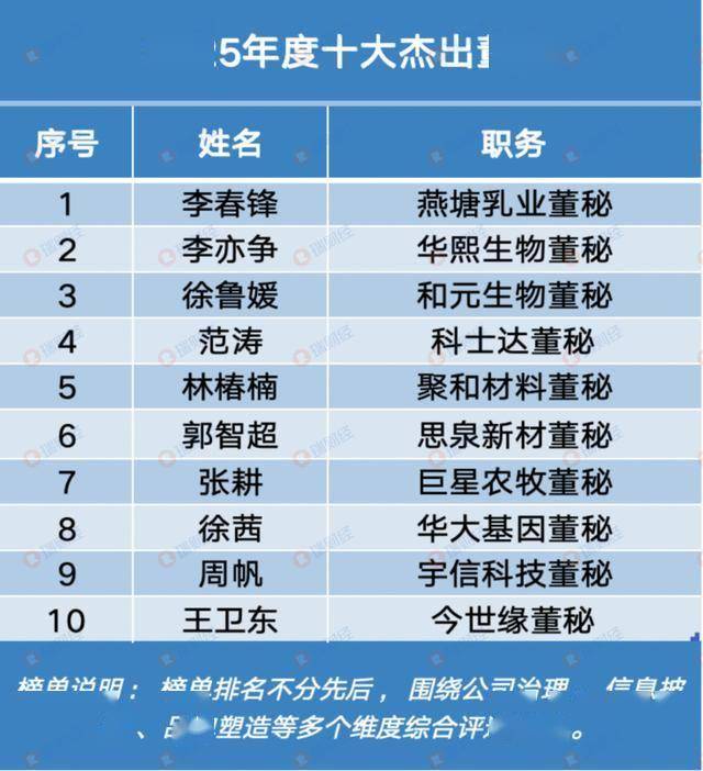 瑞财经1月21日,由瑞财经推出的"2025年度十大杰出董秘"榜单揭晓,今世缘董秘王卫东入选。 "2025年度十大杰出董秘"榜单围绕公司治理、信息披露、品牌塑造等多个维度综合评选得出。 王卫东,公司董事、副总经理、总会计师及董事会秘书。河海大学工商管理专业硕士,高级经济师,高 级会计师。2013年12月起,兼任淮安市轻工业协会常务副会长;2015年3月起,兼任华泰瑞通投资管理 有限公司董事;2018年11月起,兼任江苏省上市公司协会财务专业委员会副主任委员;2019年11月起, 兼任江苏省会计学会理事;2023年11月起,兼任中国上市公司协会第三届董秘委员会委员。 2025年,王卫东在资本市场履职、公司经营策略调整、财务与数字化管理等多个领域均有亮眼表现,有 力支撑了公司在复杂市场环境中的稳定发展。 | 序号 | 。姓名 | 职务 。 | | --- | --- | --- | | 1 | 李春锋 | 燕塘乳业董秘 | | 02 | 李亦争。 | 华熙生物董秘 | | 3 | 徐鲁媛 | 和元生物董秘 | | 4 | 范涛 | 科士达董秘 | | 5 | 林椿楠 | 聚和材料董秘 | | 6 | 郭智韶 | 思 ...