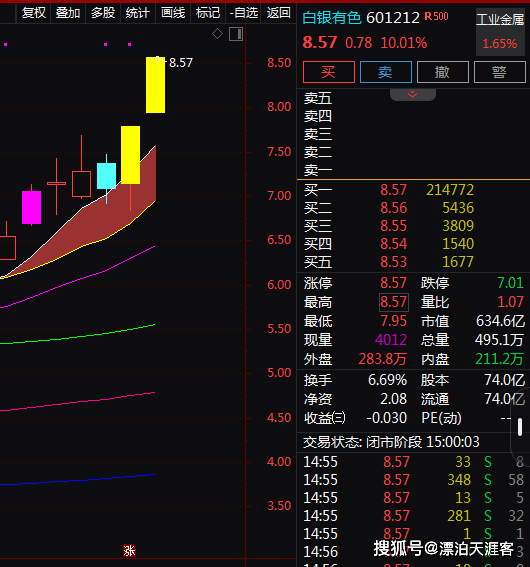 一、热门个股解读——白银有色(601212) | 复权 叠加 | 案后 | 统计 | 画光 | 标记 -自选 返回 | | | 白银有色 601212 R500 | | 工业会屋 | | | --- | --- | --- | --- | --- | --- | --- | --- | --- | --- | --- | | | | | | < | | | 8.57 0.78 10.01% | | 1.65% | | | | | | | | 8.50 | | | | | | | | | | 8.57 | | | 深 | 机 | 撒 | alu | | | | | | | | 8.00 | 交 | | | | | | | | | | | | 卖四 | | | | | | | | | | | | 英三 | | | | | | | | | | | 7.50 | 卖 | | | | | | | | | | | | 英 | | | | | | | | | | | 7.00 | | | | | | | | | | | | | 天天 | 8.57 8.56 | 214772 2436 | | | | | | | | | | ...