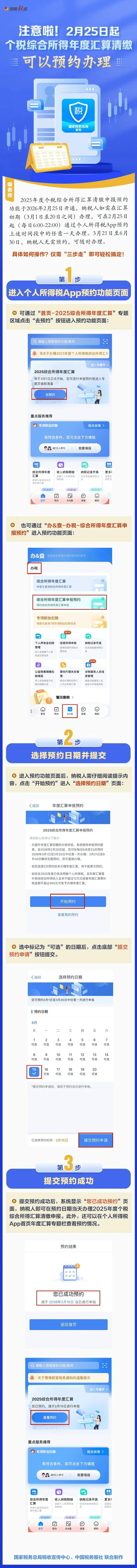 今天起,可通过个人所得税App提前预约办理2025年综合所得个税汇算。哪些时段可以进行预约?如何预约?手把手教会你。 年度汇算的时间范围是什么?纳税人可以在哪些时段进行预约? 2025年度汇算的时间为2026年3月1日至6月30日,全天候24小时随时办理。 纳税人如需在3月1日至3月20日之间办理年度汇算,可在2月25日至3月20日每天的早6点至晚10点登录手机个人所得税App进行预约。 3月21日至6月30日期间,纳税人无需预约,可以随时办理。 预约都有哪些步骤? 预约操作几步走?一图教会你! ITE 造 十 进入个人所得税App预约功能页面 O 可通过"首页-2025综合所得年度汇算"专题 区域点击"去预约"按钮进入预约功能页面: " ○ 谱验人想想索的吐 个人所得税综合所得汇 2025综合所得年度汇算 将于3月1日正式开始,您可进行申报预约或进入专 题页提前准备 去预约 重点服务推荐 ◆ 专项附加扣除 相关政策 > 若符合条件,您可点击下方填报 我要填报 超1亿人参与 综合所得年度 收入纳税明细 纳税记录开具 庫多] 汇算 生成或查看纳税证 資看个人所得税纳 申报与查询综合所 指定属汇局 > FD 9 ...