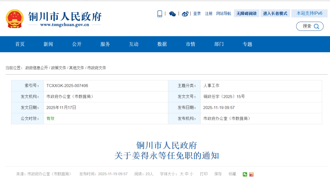 11月19日 | 索引号: | TCXXGK-2025-007406 | 主题分类: | 人事工作 | | --- | --- | --- | --- | | 发文机构: | 市政府办公室(市数据局) | 发文文号: | 铜政任字〔2025〕15号 | | 发文日期: | 2025年11月17日 | 发布日期: | 2025-11-19 09:57 | | 公文时效: | 有效 | 发布机构: | 市政府办公室(市数据局) | 各区县人民政府,市新区管委会,市政府各工作部门、直属事业单位: 市政府2025年11月17日决定,任命: 姜得永为市农业农村局(市乡村振兴局)副局长。 免去: 程永红的市市场监管局副局长职务; 姚咪娜的市政府驻深圳办事处(市劳务管理处)副主任职务; 王有恒的市人民医院副院长职务。 铜川市人民政府 2025年11月17日 来源:铜川市人民政府网站 铜川市人民政府网站发布 关于姜得永等任免职的通知 | 鲁 铜川市人民政府 > | | | | | □ ✪ ✪ 登录 注册 网站导航 无障碍阅读 进入长者模式 | | | | 本站支持IPv6 | | --- | --- | --- | --- ...