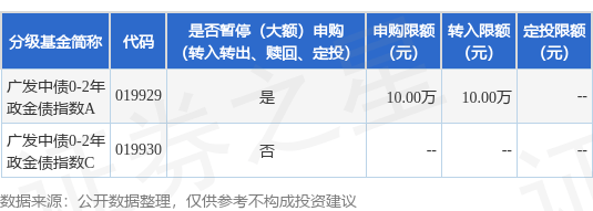 证券之星消息,11月19日广发基金管理有限公司发布《关于广发中债0-2年政策性金融债指数证券投资 基金A类基金份额暂停机构投资者大额申购(含转换转入、定期定额和不定额投资)业务的公告》。公 告中提示,为保护基金份额持有人利益,自2025年11月19日起广发中债0-2年政策性金融债指数证券投 资基金A类基金份额暂停机构投资者大额申购(含转换转入、定期定额和不定额投资)业务,下属分级 基金调整明细如下: 以上内容为证券之星据公开信息整理,由AI算法生成(网信算备310104345710301240019号),不构成 投资建议。 | 分级基金简称 | 代码 | 是否暂停(大额)申购 | 申购限额 转入限额 定投限额 | | | --- | --- | --- | --- | --- | | | | (转入转出、赎回、定投) | (元) (元) | (元) | | 广发中债0-2年 政全债指数A | 019929 | 를 | 10.00万 10.00万 | | | 广发中债0-2年 政全债指数C | 019930 | KO | | | ...