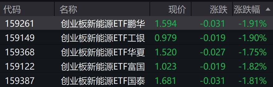 每经记者:叶峰 每经编辑:肖芮冬 | 代码 | 名称 | 现价 | | 涨跌 涨跌幅 ▲ | | --- | --- | --- | --- | --- | | 159261 | 创业板新能源ETF鹏华 | 1.594 | -0.031 | -1.91% | | 159149 | 创业板新能源ETF工银 | 0.979 | -0.019 | -1.90% | | 159368 | 创业板新能源ETF华夏 1.520 | | -0.027 | -1.75% | | 159122 | 创业板新能源ETF富国 | 1.023 | -0.019 | -1.82% | | 159387 | 创业板新能源ETF国泰 | 1.681 | -0.031 | -1.81% | 新能源概念股走弱,阳光电源、天华新能跌超4%,宁德时代、亿纬锂能跌超3%。 受盘面影响,创业板新能源相关ETF跌近2%。 有券商表示,短期市场正处于关键的政策衔接与转换期。新能源车市场正逐步过渡至依靠产品力与常态化消费节奏的新阶 段,看好以下方向:一是具备差异化和产品力的高端化厂商,其产品受补贴规则变化以及购置税减半影响相对较小,且在我 国乘用车市场高端 ...