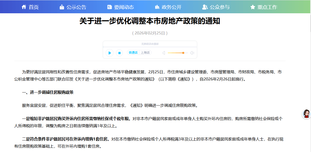 2月25日,上海正式发布2026年首个房地产新政——"沪七条",旨在更好满足居民刚性和改善性住房需求。该政策由市住建委、市房管局等部门联合印发, 涉及限购、公积金及房产税三大领域调整,并将于2月26日起施行。 此次调整中,非沪籍居民购买外环内住房的社保或个税缴纳年限由"连续满3年"缩短至"满1年";连续缴纳满3年及以上者,可在执行现有限购政策基础上, 于外环内增购1套住房。 公积金政策大幅优化,首套房公积金贷款最高额度由160万元提升至240万元,叠加多子女家庭及绿色建筑上浮政策后,家庭最高可贷324万元。此外,对已 结清公积金贷款的缴存人家庭,若上海名下无房或仅有一套,再次购房时可重新申请公积金贷款。 房产税方面,对户籍家庭中的成年子女,若新购住房为其家庭唯一住房(不含未成年时与父母共有的住房),暂免征收个人住房房产税,支持置换改善需 求。 业内分析认为,新政在释放刚需及改善型购房活力的同时,也将直接带动家装、家居等下游消费市场,为2026年上海家居行业带来积极预期。 ...