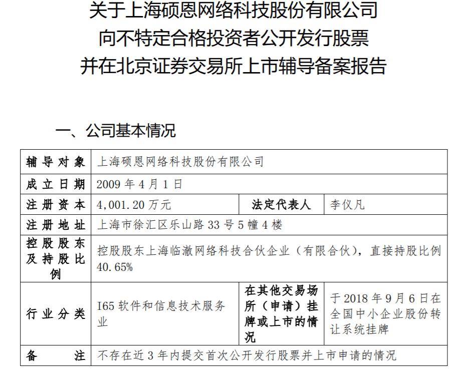 业绩方面,2025年上半年,硕恩网络实现营业收入为8838.75万元,同比增长10.16%;归属于挂牌公司股东的净利润1713.83万 元,同比增长15.19%。 2024年,硕恩网络实现营业收入2.27亿元,同比增长18.34%;归属于挂牌公司股东的净利润为4428.16万元,同比增长19.75%。 据硕恩网络最新披露的股票定向发行情况报告书,公司实际控制人及一致行动人李仪凡、韦南、黄云通过控制前照咨询和临澈网 络实际可以控制公司79.41%的股份。 公司董事长、董事李仪凡与董事、总经理韦南系夫妻关系;董事黄云与董事祖玉宁系夫妻关系。 | 辅导对象 | 上海硕恩网络科技股份有限公司 | | | | --- | --- | --- | --- | | 成立日期 | 2009年4月1日 | | | | 女女安女 | 4,001.20 万元 | 法定代表人 | 李仪凡 | | 注册地址 | 上海市徐汇区乐山路 33 号 5 幢 4 楼 | | | | 控股股东 及持股比 | 控股股东上海临澈网络科技合伙企业(有限合伙),直接持股比例 | | | | 例 | 40. 65% | | | | 行业分类 | I65 软 ...