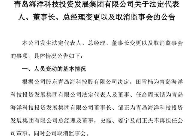 2月25日,青岛海洋科技投资发展集团有限公司(以下简称"青岛海洋科投集团")发布关于法定代表 人、董事长、总经理变更以及取消监事会的公告。 青岛海洋科投集团在公告中表示,本次资产划转对企业生产经营、财务状况及偿债能力不会构成重大不 利影响,对净资产、营业收入、净利润、现金流等财务指标不会产生重大不利影响。 据了解,青岛海洋科投集团成立于2012年12月,注册资本20亿元,经营范围包含建设工程施工、住宅室 内装饰装修、水产养殖、水产苗种生产、旅游业务、汽车零配件批发、橡胶制品销售、轮胎销售等。 财报显示,青岛海洋科投集团2025年前三季度实现营业总收入9.4亿元,实现净利润4176.89万元;截至 2025年9月30日,公司总资产为360.09亿元,所有者权益合计122.22亿元。 青岛海洋科投集团近期大动作不断。2月10日,青岛海洋科投集团曾发布公告称,为优化调整国有资本 布局,将其持有的青岛蓝谷人才服务有限公司100%股权、青岛海科物业管理有限公司100%股权、青岛 蓝谷国际酒店有限公司100%股权以及青岛蓝谷产业发展有限公司55%股权无偿划转至青岛蓝谷高创控 股有限公司。 公告显示,上述无偿划转标的资产的 ...