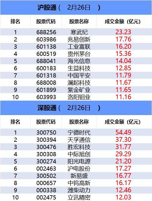 龙虎榜方面,沪电股份强势涨停,多路资金联手抢筹,其中三家机构买入3.84亿,深股通买入7.37亿,一家一线游资(国泰海通证券武汉紫阳东路)买入 2.92亿,一家量化资金(开源证券西安太华路)买入2.12亿。大族激光今日封涨停,遭三家机构卖出3.7亿。 一、沪深股通前十大成交 今日沪股通总成交金额为1450.59亿,深股通总成交金额为1717.9亿。 板块资金流出方面,有色金属板块主力资金净流出居首。 | 排名 | 股票名称 | 主力资金净流入(亿元) | 主力资金净流入率(%) | | --- | --- | --- | --- | | 1 | 沪电股份 | 15.79 | 13.66 | | 2 | 胜宏科技 | 13.90 | 5.63 | | 3 | 草通光电 | 10.94 | 19.15 | | 4 | 华胜天成 | 9.45 | 13.54 | | 5 | 润泽枝 | 9.30 | 6.36 | | 6 | 繋で光电 | 8.11 | 25.20 | | 7 | 航大动力 | 7.92 | 23.85 | | 8 | 中大科技 | 7.21 | 22.63 | | 9 | 芯原股份 | 6.59 ...