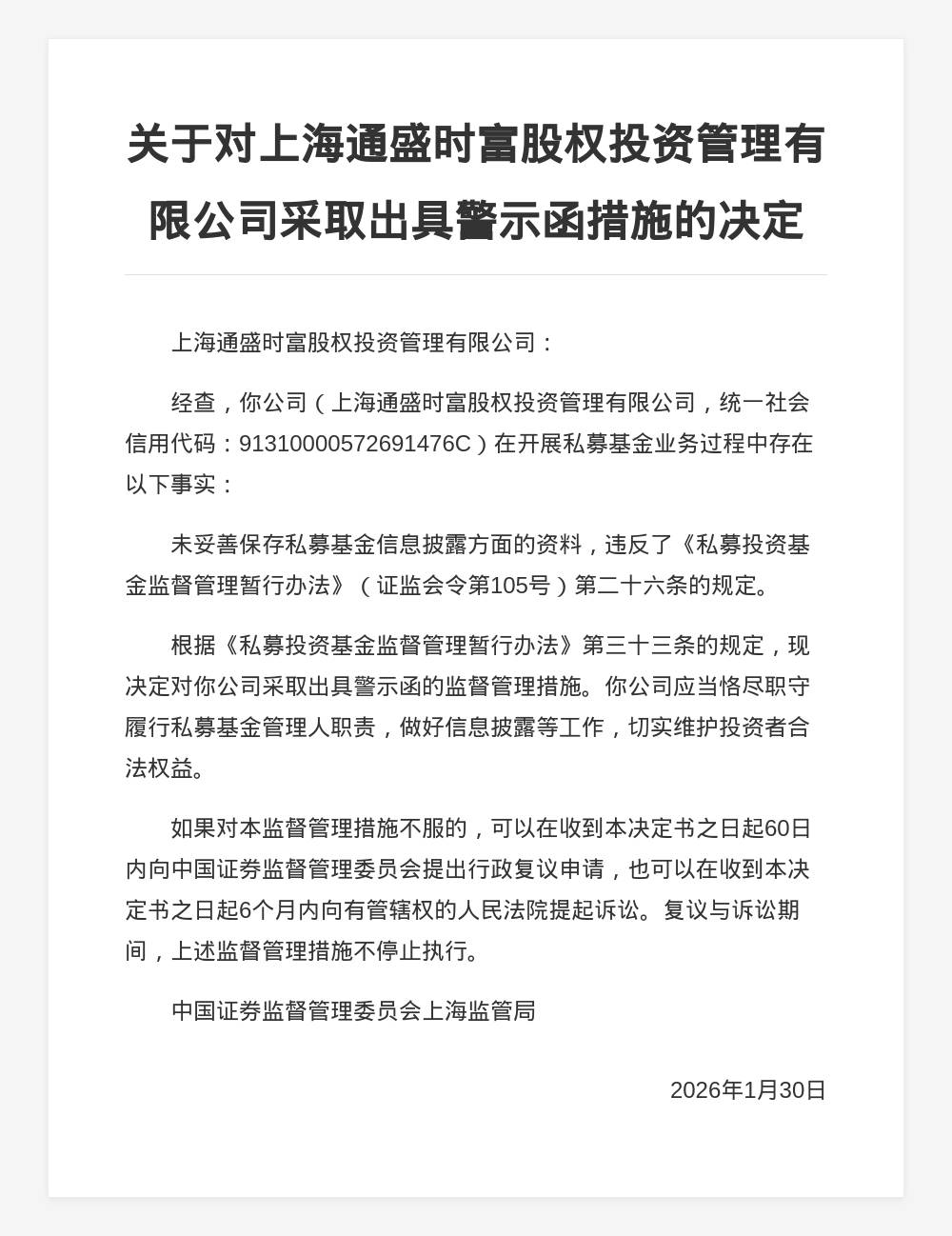 上海通盛时富股权投资被出具警示函,涉未妥善保存信披资料