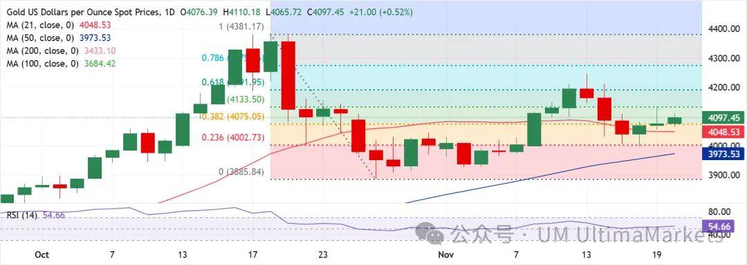 今日Ultima Markets为您带来了 2025年11月20日的黄金深入分析 ·黄金在周四早盘重新尝试突破4100美元,期待美国就业数据的推动。 ·美元接近十天高位,风险偏好情绪抵消鹰派美联储会议纪要的影响。 ·黄金周三收盘于4075美元阻力位之上;相对强弱指数保持看涨。接下来会如何? 黄金在周四早盘再次尝试突破4100美元,因美元(USD)在风险偏好的市场环境中暂停上涨,同时等待当天稍晚公布的至关重要的九月份非农就业数据 (NFP)报告。 然而,在芯片制造商英伟达(Nvidia)在市场收盘后发布的乐观业绩提供了极大缓解,并引发了全面的风险偏好反弹后,局势似乎再次转向黄金买家有 利。 市场的乐观情绪延续到亚洲交易时段,限制了美元的持续上涨,同时恢复了黄金向4100美元门槛的回升动能。 黄金的下一步上涨取决于美国就业数据的发布,这可能会改变市场对美联储下个月是否降息的预期。 预计非农就业数据将显示,美国经济在九月份新增5万个就业岗位,而八月份的新增就业岗位为2.2万个。失业率预计在同一时期保持在4.3%。与此同时, 预计九月份的平均时薪年增幅为3.7%,与八月份的增幅相同。 任何与预期的显著偏差都可能影响美 ...