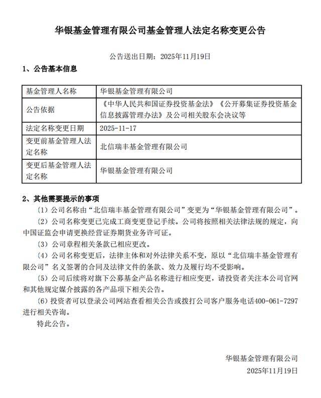 深圳商报·读创客户端记者 詹钰叶 | 基金管理人名称 | 华银基金管理有限公司 | | --- | --- | | 公告依据 | 《中华人民共和国证券投资基金法》 《公开募集证券投资基金 | | | 信息披露管理办法》及公司相关股东会决议等 | | 法定名称变更日期 | 2025-11-17 | | 变更前基金管理人法 定名称 | 北信瑞丰基金管理有限公司 | | 变更后基金管理人法 | 华银基金管理有限公司 | | 定名称 | | 公司官网公告 根据公司11月19日发布的《基金管理人法定名称变更公告》,自11月17日起,其名称由此前的"北信瑞 丰基金管理有限公司"变更为"华银基金管理有限公司",并已完成工商变更登记手续;公司后续将对旗 下公募基金产品名称进行相应变更。记者注意到,公司官网的公司名称已变更为华银基金;原本蓝灰主 色调的logo也出现变更,完全复制了华夏银行的红白logo,公众号logo暂未变更。 北信瑞丰基金管理有限公司基金行业高级管理人员变更公告 公告送出日期: 2025年11月18日 1 公告基本信息 原北信瑞丰基金宣布,公司名称由"北信瑞丰基金管理有限公司"变更为"华银基金管理有限公司" ...