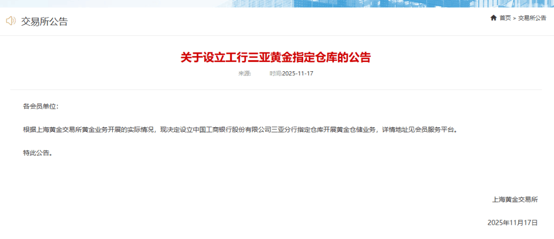 11月17日,上海黄金交易所公告显示,中国工商银行三亚分行指定仓库正式设立并开展黄金仓储业务。这一看似常规的基础设施布局,在当前黄金市场结 构性增配热潮与银行贵金属业务竞争升级的背景下,成为行业格局重塑的重要信号——既标志着银行贵金属业务竞争从零售端转向产业链核心环节,也折 射出黄金需求南移与自贸港政策叠加下的市场新趋势,更将深刻影响投资者与产业客户的服务体验及成本结构。 图片源于上海黄金交易所 黄金指定仓库并非普通业务载体,而是上海黄金交易所体系内的核心基础设施,承担着实物黄金储存、清算、交割等关键职能,是黄金流通链条的"安全 底座",其高安全等级、严风控标准与复杂运营要求,决定了仅头部金融机构具备承接资质。 作为国内贵金属业务规模最大、品类最齐全的银行之一,工行早已是黄金做市、租赁及对公业务的核心参与者。此次三亚指定仓库落地,意味着工行完成 了从"产品端优势"到"基建端领先"的跨越,进一步强化产业链话语权:一方面,掌握交割核心环节后,工行在黄金租赁、质押融资、加工流通等业务中可 实现更灵活的定价策略;另一方面,能有效辐射华南地区矿企、珠宝加工企业及机构客户,扩大服务半径的同时锁定稳定客群。 在银行业利差收 ...