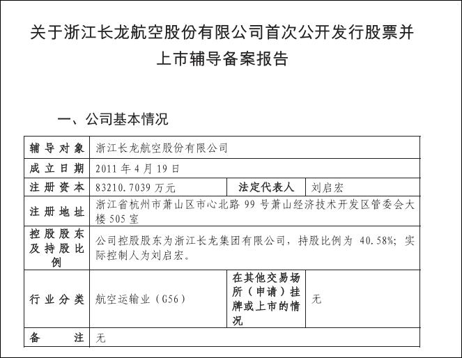 在入选《杭州市重点拟上市企业名单》(2025年7月版)后,长龙航空IPO之路迎来新进展。 11月18日,证监会网站显示,浙江长龙航空股份有限公司已办理辅导备案登记,拟首次公开发行股票并 上市。 | 辅导对象 | 浙江长龙航空股份有限公司 | | --- | --- | | 成立日期 | 2011年4月19日 | | 注册资本 | 83210.7039 万元 法定代表人 刘启宏 | | 注册地址 | 浙江省杭州市萧山区市心北路 99 号萧山经济技术开发区管委会大 楼 505 室 | | 控 股 股 东 及持股比 例 | 公司控股股东为浙江长龙集团有限公司,持股比例为 40.58%;实 际控制人为刘启宏。 | | 行业分类 | 在其他交易场 所(申请)挂 航空运输业(G56) 无 脾或上市的情 現 | | 各 注 | 无 | 长龙航空成立于2011年4月,是浙江省唯一本土客、货运航空公司,属中大型航空公司,居民营航空公 司前列。浙江长龙集团有限公司为长龙航空控股股东,持股40.58%,刘启宏为实际控制人。 天眼查显示,自2021年12月以来,长龙航空已进行多轮融资,背后不乏国资身影,如浙江创新产业基 金、杭州创新 ...