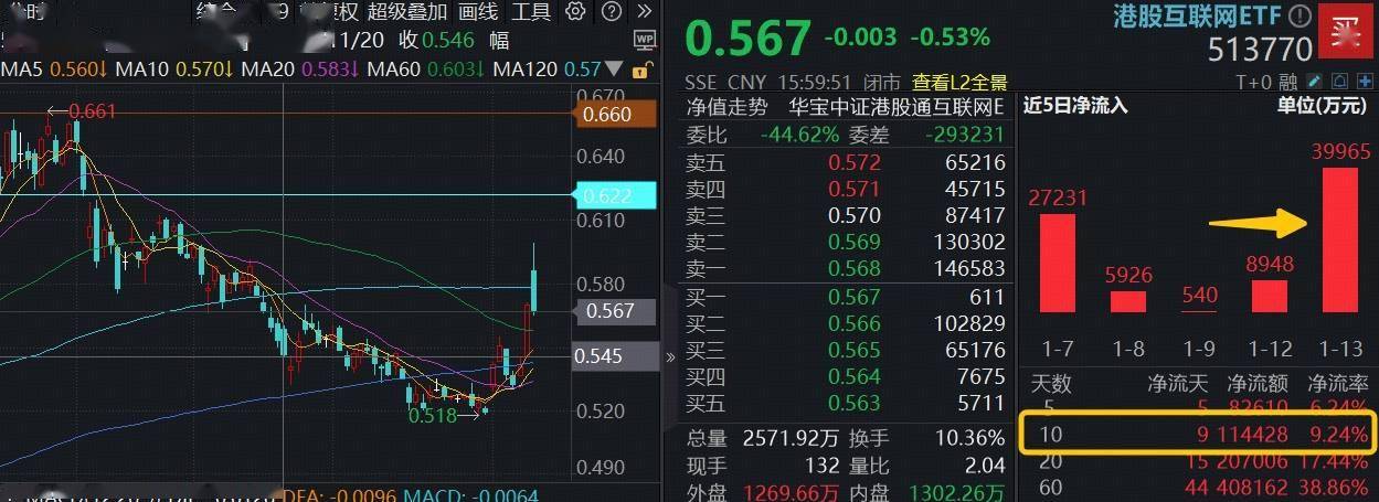 1月13日,港股AI短线歇脚,港股AI核心工具——港股互联网ETF(513770)冲高回落,场内价格微跌0.53%,资金逢机积极抢筹,上交所数据显示,港股 互联网ETF(513770)单日获资金大举净流入4亿元,近10日累计吸金11.44亿元。 把握2026 AI行情主线,关注港股AI核心工具!港股互联网ETF(513770)及其联接基金(A类017125;C类017126)被动跟踪中证港股通互联网指数,权重 股汇聚阿里巴巴-W、腾讯控股、小米集团-W、快手-W、哔哩哔哩-W等港股AI巨头及各领域应用公司,前十大权重股占比超78%,龙头优势显著。 | 十大秋झ | | | | 更新日期: 2028-01-06 | | --- | --- | --- | --- | --- | | 证券代码 | 证券名称 | 中证一级行业分类 | 中证二级行业分类 | 权重(%) | | 0700 HK | 腾讯控股 | 通信服务 | 传媒 | 15.42 | | 9988 HK | 阿里巴巴-W | 可选消费 | 幸喜小 | 14.50 | | 1810 HK | 小米集团-W | 信息技术 | 电子 | 13.11 | | ...