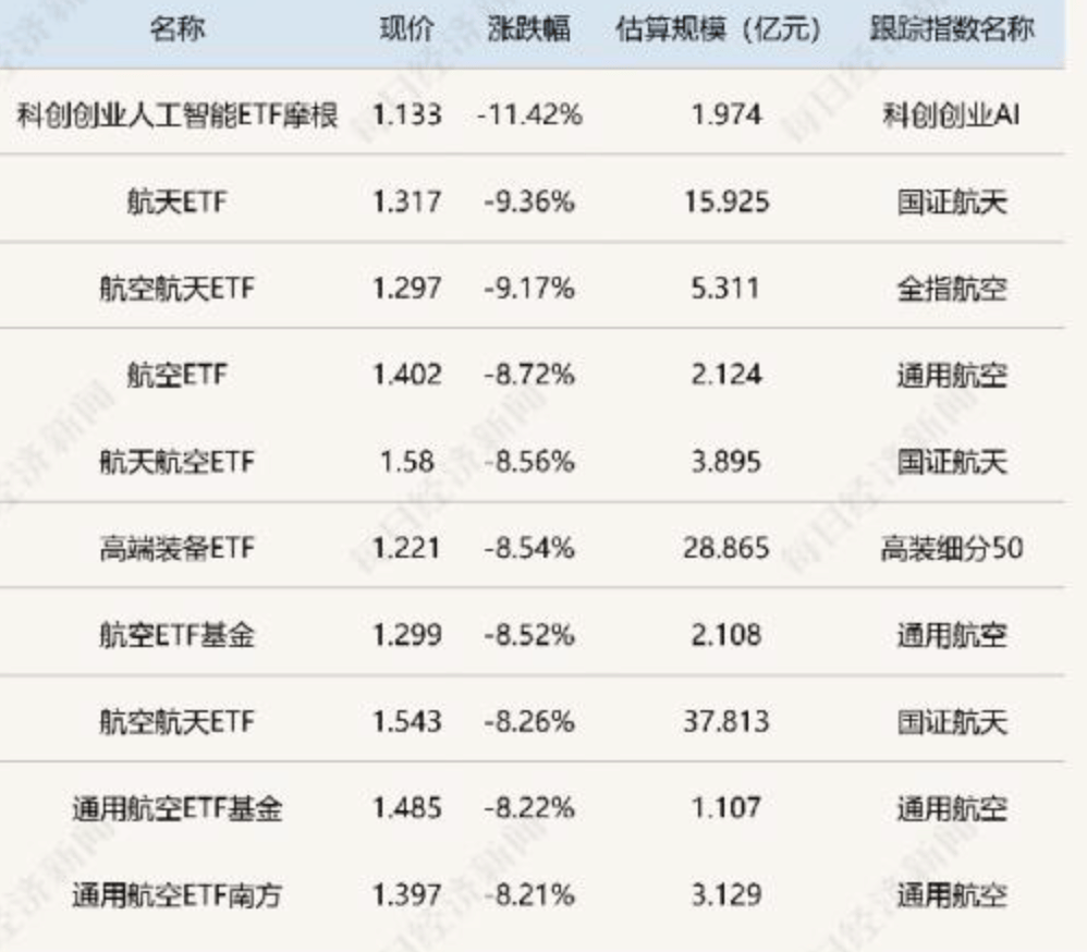 现在的问题是,这些规模最终能存的住么,持仓的这些投资者能赚到钱么?这是需要回答的问题,还有就是监管对这些现象意识到问题了没 有,很多时候市场不理性的时候,我们要学会看到问题,这样才能更好的保护自己。 结论很简单,对于热门的赛道ETF投资的时候悠着点,一定要控制好比例,千万别抱着发财的梦想。 免责声明:文中内容仅供参考,不构成任何操作建议或提示,股市有风险,投资请谨慎! 商业航天昨天出现了重挫,相关的ETF跌幅在5%左右,当然这个跌幅并不算大,有比这更夸张的,有些航天航空相关的ETF单日跌幅在9%, 而还有刚刚起来的AI应用方面,比如说个别的科创创业人工智能ETF单日下跌超过11%。 看到这样的波动,不知道大家作何感想?似乎也在警告我们,最近主题赛道似乎有点过热了,我看到有人对过往时间的主题赛道的涨幅和表 现做了一个统计,可能唯一一个表现时间长、涨幅明显的就是商业航天了,大多数主题赛道的表现都很一般,这样说其实已经很客气了,简 单说几乎都是从哪里起来的又回到了那里,表现的时间周期很短,等你刚刚明白过来的时候,结果短期就见顶了。 | 名称 | 现价 - | 涨跌幅 | 估算规模(亿元) | 跟踪指数名称 | | ...