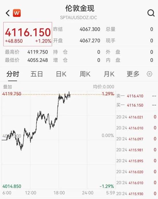 截至记者发稿,现货黄金报4116.15美元/盎司,日内大涨1.2%。 来源:市场资讯 【导读】现货黄金逼近4120美元/盎司,日内大涨1.2% 来源:中国基金报 记者 张舟 一度跌至3997美元后,现货黄金再度快速拉升! 北京时间11月19日晚间,现货黄金快速拉升。 北京时间周四凌晨3点,美联储将公布其10月份会议纪要,会议纪要将详细展现多数决策者在10月会议 期间对未来利率路径的看法。 过去几天,受美联储鸽派预期减弱等影响,黄金价格持续承压,昨日(11月18日)一度向下触及3997美 元/盎司。 从消息面看,11月19日,印度尼西亚央行行长表示,作为避险资产,资金流入黄金的趋势仍在持续。 StoneX资深市场分析师马特·辛普森表示,黄金期货可能迎来短期反弹。日线图已连续第二个交易日形 成看涨锤子线形态。尽管日相对强弱指数尚未进入超卖区间,但已接近该阈值,表明短期低点可能已经 出现,或即将形成。 目前,市场正屏息以待美联储会议纪要发布。 ...