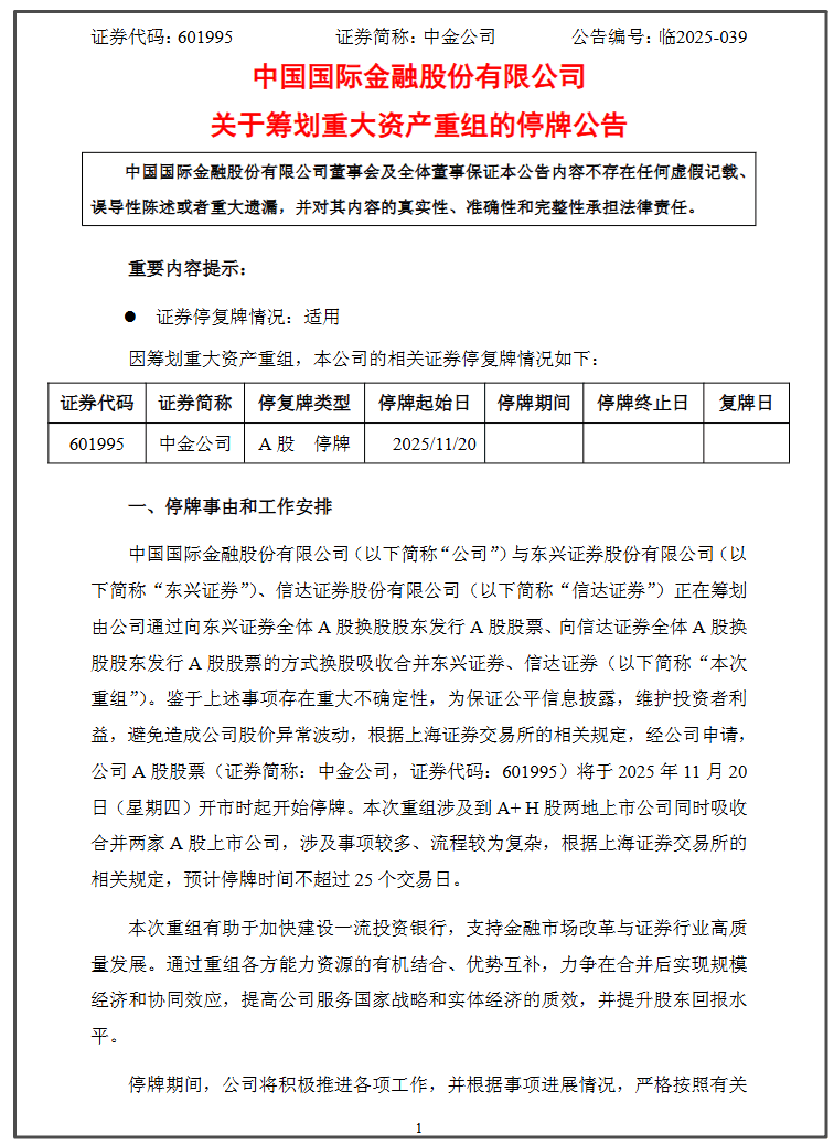 中金公司11月19日发布公告,中国国际金融股份有限公司与东兴证券股份有限公司、信达证券股份有限公 司正在筹划由中金公司通过向东兴证券全体A股换股股东发行A股股票、向信达证券全体A股换股股东发行 A股股票的方式换股吸收合并东兴证券、信达证券。 证券代码:601995 证券简称:中金公司 公告编号:临2025-039 中国国际金融股份有限公司 关于筹划重大资产重组的停牌公告 中国国际金融股份有限公司董事会及全体董事保证本公告内容不存在任何虚假记载、 误导性陈述或者重大遗漏,并对其内容的真实性、准确性和完整性承担法律责任。 重要内容提示: ● 证券停复牌情况:适用 因筹划重大资产重组,本公司的相关证券停复牌情况如下: | 证券代码 证券简称 停复牌类型 停牌起始日 停牌期间 停牌终止日 复牌日 | | --- | | ୧01992 中金公司 A 股 停牌 2025/11/20 | 一、停牌事由和工作安排 鉴于上述事项存在重大不确定性,为保证公平信息披露,维护投资者利益,避免造成公司股价异常波动, 根据上海证券交易所的相关规定,经公司申请,中金公司A股股票将于2025年11月20日开市时起开始停牌。 本次重组涉及到A ...