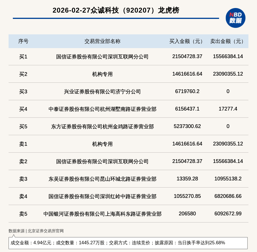 (记者 曾健辉) 免责声明:本文内容与数据仅供参考,不构成投资建议,使用前核实。据此操作,风险自担。 每日经济新闻 每经讯,2026年2月27日,北交所上市公司众诚科技(920207,收盘价:34.89元)登上龙虎榜,交易方式是连续竞价,披露原因 是当日换手率达到25.68%,成交数量1445.27万股,成交金额4.94亿元。买一席位为国信证券股份有限公司深圳互联网分公司, 买入2150.47万元;卖一席位为机构专用,卖出2309.04万元。 | | 2026-02-27众诚科技 (920207) 龙虎榜 | | | | --- | --- | --- | --- | | 序号 | 交易营业部名称 | 买入金额(元) | 卖出金额(元) | | ポリ | 国信证券股份有限公司深圳互联网分公司 | 21504728.37 | 15566384.14 | | 买2 | 机构专用 | 14616616.64 | 23090355.12 | | 考3 | 兴业证券股份有限公司济宁分公司 | 6719760.2 | 0 | | द्र 4 | 中泰证券股份有限公司杭州湖墅南路证券营业部 | 6156437.1 | 17 ...