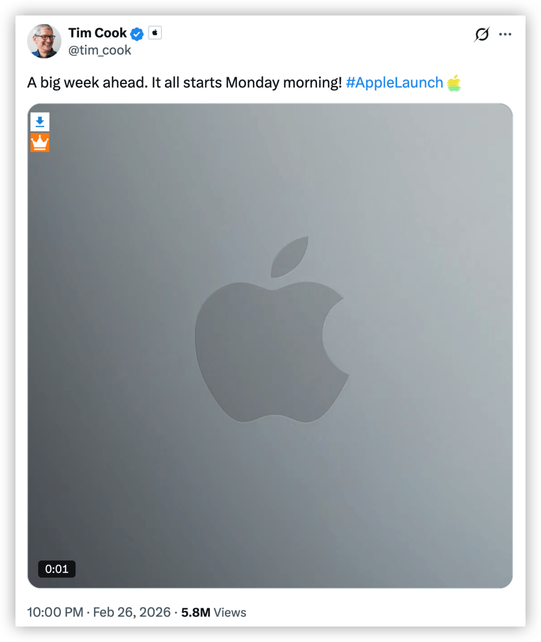 正如我们之前预料的那样,苹果终于官宣了新品发布计划。 相较此前的 Greg,这次的官宣直接由 CEO 库克牵头。 在 X 平台上,库克表示:接下来的一周至关重要,一切都要从周一早上开始! 随后,库克也在微博上发布了同样的消息。 图片来源:社交平台 外界普遍认为,这暗示了下周发布的新品将以 Mac 系列为主。 并正式确定了时间,国内为北京时间 3 月 2 日晚间。 虽然并未直接明说,但结合此前多方爆料来看,库克这波操作基本就是在预热新品。 图片来源:社交平台 在这条推文下方,库克还配上了一段 6 秒的短片。 视频中,一双手通过意象创作手法,「捏」出了一个标准的苹果 logo。 结合灰色背景来看,这幅构图看上去十分类似 MacBook 机身上的经典设计。 截至目前,关于苹果即将发布的新品,基本已不再是秘密。 前特斯拉员工@Mark Anthony 甚至还在库克的推文下方,明确指出了下周的新品发布顺序: 周一:iPhone 17e 周二:新 MacBook Pro&Air,以及入门款「MacBook SE」 周三:M4 iPad Air(或许还有 A19 iPad) 从评论区的反馈来看,大家对这一推测还是比较认可的 ...