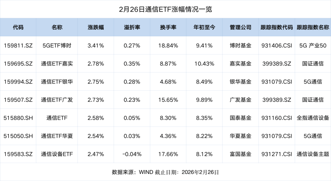 来源:ETF洞察 【导读】通信ETF集体涨超2%,AI算力主线再成市场焦点 另外,跟踪中证全指通信设备指数和中证通信设备主题指数的ETF各有一只,分别为国泰基金的通信ETF和富国基金的通信设备ETF,日涨幅分别为2.58% 和2.47%。 中国基金报记者 王思文 大家好!这里是"ETF洞察"。今天我们来聊聊通信ETF。 2月26日,A股三大指数涨跌互现。盘面上,受英伟达业绩超预期驱动,叠加国内技术突破提振市场情绪,算力硬件板块强势拉升,通信板块冲击阶段新 高,光通信概念股走强,CPO概念震荡拉升,多股涨停。 先来梳理一下市场上的通信行业指数。 当前市场上的通信行业指数布局还是很丰富的,今天的表现也十分亮眼。 然而,并非所有通信行业指数都有对应的跟踪ETF,目前已有产品覆盖的主要是上述后5个指数,合计7只ETF。它们已经成为市场捕捉通信板块行情的优 质工具。 多只通信类ETF大涨 受板块行情带动,今日7只通信类ETF大幅上涨,成为场内焦点品种。 具体来看,跟踪中证5G产业50指数的5G ETF博时涨幅领先,日涨幅达3.41%。该产品溢价率为0.27%,换手率为18.84%,年初至今涨幅已超9%。 跟踪国证通信指 ...