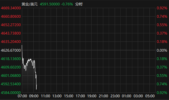 据Choice数据,1月15日,国际现货黄金盘中短线走低,截至9:33报4591.5美元/盎司,日内跌0.76%。 上证报中国证券网讯 据Choice数据,1月15日,国际现货黄金盘中短线走低,截至9:33报4591.5美元/盎 司,日内跌0.76%。 ...