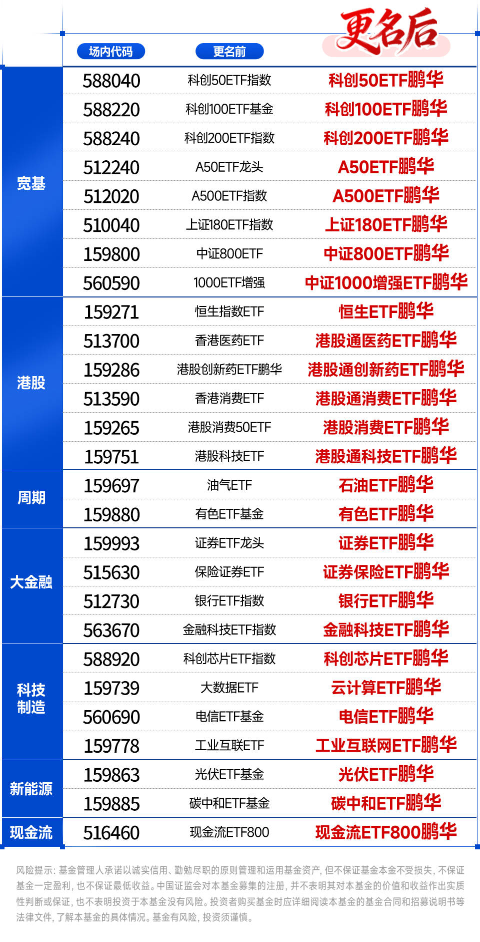 这种"简洁至上"的原则,在市场扩容后逐渐暴露出弊端。随着指数化投资深入人心,同一热门指数下汇聚十余只甚至数十只ETF成为常 态,旧有命名方式遭遇挑战:为在相似中求差异,部分产品开始采用同义词替换、添加修饰词等做法。这导致了简称的冗余、偏差甚至 误导,投资者筛选成本陡增。 沪深交易所在2025年明确发布规范,要求所有存量ETF的扩位简称须采用"投资标的核心要素+ETF"的结构,并包含基金管理人简称,且 须在2026年3月31日前完成调整。这一规定从制度层面终结了命名混乱。 在此背景下,鹏华基金的本次集中更名,正是对新规的及时、全面响应。本次更名包括27只产品: | | 场内代码 | 更名前 | | | --- | --- | --- | --- | | 眾星 | 588040 | 科创50ETF指数 | 科创50ETF - | | | 588220 | 科创100ETF基金 | 科创100ETENER | | | 588240 | 科创200ETF指数 | 科创200ETF服车 | | | 512240 | A50ETF龙头 | A50ETFH412 | | | 512020 | A500ETF指数 | A50 ...