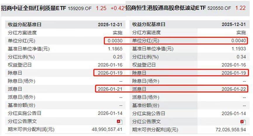 深度价值策略:以港股红利低波ETF(520550)为代表 该产品跟踪恒生港股通高股息低波动指数,采用"高股息+低波动"双因子筛选逻辑,重点布局金融、公用事业等具备防御属 性的板块。指数当前股息率超过7%,结合港股市场的估值优势及央企分红政策支持,呈现出较强的抗波动特征。 招商基金旗下两只特色红利策略ETF同步公告本月分红。其中,中证红利质量ETF(159209)迎来年度第七次分红,每份派 现0.003元,港股红利低波ETF(520550)迎来年内第九次分红,每份派现0.004元。 | 收益分配基准日 | 2025-12-31 | 收益分配基准日 | 2025-12-31 | | --- | --- | --- | --- | | 分红方案进度 | 实施 | 分红方案进度 | 理论 | | 单位分红(元) | 0.0030 | 单位分红(元) | 0.0040 | | 墓准日单位净值(元) | 1.1865 | 基准日单位净值(元) | 1.1933 | | 分红比例(%) | 0.25 | 分红比例(%) | 0.34 | | 权益登记日 | 2026-01-16 | 权益登记日 | 2026-01-16 | ...
