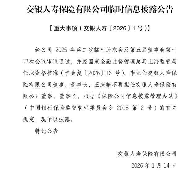 1月14日,交银人寿官网发布公告称,经股东会及董事会审议通过,并经上海金融监管局任职资格核 准,李亚出任交银人寿董事长、董事,王庆艳不再担任交银人寿董事长、董事。 官网资料显示,李亚,1970年7月出生,曾任交通银行南宁分行党委委员、副行长,交通银行广西区(南 宁)分行党委书记、行长,交通银行普惠金融事业部(原小企业金融部)总经理、乡村振兴金融部总经理、 股权与子公司管理部(股权与投资管理部)总经理等职。2025年7月起任交银人寿党委书记。 ...