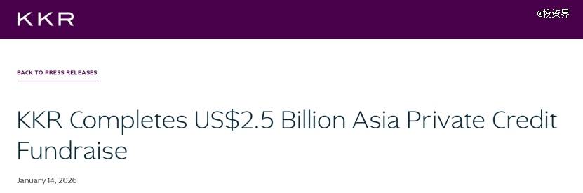 KKR来了。 投资界获悉,本周KKR宣布完成25亿美元(约170亿人民币)亚洲私募信贷基金募资,将重点投资于亚太地区的非公 开市场优质信贷资产。 自2019年以来,KKR通过其亚洲信贷策略已在亚太地区完成逾60笔投资项目,其中约83亿美元由KKR出资,交易总值 达275亿美元,涵盖针对医疗、教育、房地产、物流和基础设施等行业的大型企业与金融投资人提供的控股收购融资 和定制化资本解决方案。 如今,KKR继续加码重仓。 KKR新年第一笔募资 KKR在2026年的第一笔募资来了。 具体来看,本次总规模25亿美元的募资包含18亿美元的KKR亚洲信贷机遇基金二期(KKR Asia Credit Opportunities Fund II,简称"ACOF II"或"二期基金"),以及7亿美元的专注于同类投资机会的独立管理机构账户。 募资完成后,KKR将拥有专注于亚太市场的最大区域性优质私募信贷基金。 KKR透露,此次基金的募集获得了多元化新老投资者的大力支持,包括保险公司、公共和企业养老金、主权财富基 金、家族办公室、银行、大型企业及资产管理机构。 此前,KKR首只亚太地区私募信贷基金KKR亚洲信贷机遇基金在2022年完 ...