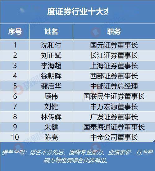 李海超,男,1968年出生,中国经济学博士,现任上海证券党委书记、董事长,曾长期任职于国家发改 委、中国证监会系统等机构。2023年10月,李海超接替到龄退休的何伟出任上海证券董事长,完成职务 调整。 2025年,李海超带领集团通过财富管理、资产管理双轮驱动实现业绩跨越式增长,同时借助数字化创新 提升服务质效,为行业树立了标杆。 | | 度证券行业十大? | | | --- | --- | --- | | 序号 | 姓名 | 职务 | | 1 | 沈和付 | 国元证券节事长 | | 2 | 刘正斌 | 长江证券节事长 | | 3 | 李海超 | 上海证券董事长 | | 4 | 徐朝晖 | 西部证券节事长 | | 5 | 龚旨求 | 中邮证券总经理 | | 6 | 顾伟 | 国联民生证券董事长 | | 7 | 刘健 | 申万宏源董事长 | | 8 | 林传辉 | 广发证券青事长 | | 9 | 朱健 | 国泰海通证券董事长 | | 10 | ◎ 陈亮 | 中令公司青事长 | | | 梓单尚明:排名不分先后,围绕专业能力、业绩表现 行业/ | | | | 响力等维度综合评选得出。 | | 瑞财经1月15日,由瑞财 ...