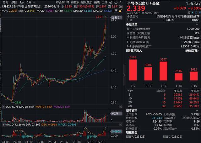 1月16日,半导体板块延续涨势,半导体设备ETF基金(159327) 收盘涨3.5%创上市以来新高;成分股天 岳先进20cm涨停,晶升股份涨超13%,上海合晶涨超10%,康强电子、金海通10cm涨停。 半导体设备ETF基金(159327)紧密跟踪中证半导体材料设备主题指数,该指数从沪深市场中选取40只业 务涉及半导体材料和半导体设备等领域的上市公司证券作为指数样本,反映沪深市场半导体材料和设备 上市公司证券的整体表现。场外投资者也可通过联接(A类 023828 ,C类 023829)布局,共享半导体 产业景气度上行以及芯片国产化红利。 (基金有风险,投资须谨慎) 半导体行业催化不断。1月15日,台积电财报出炉:第四季度净利润同比跃升35%,不仅远超市场预 期,还刷新历史纪录,这也是其连续第八个季度实现利润同比增长。公司预计2026年资本支出将达520 亿至560亿美元,较2025年实际支出409亿美元增长约37%,创历史新高。这一空前投资力度凸显全球头 号晶圆代工厂正全力扩产,以应对人工智能芯片持续高涨的需求。 产业层面,TrendForce集邦咨询发布的最新报告表示,预估整体一般型DRAM(Conventi ...
