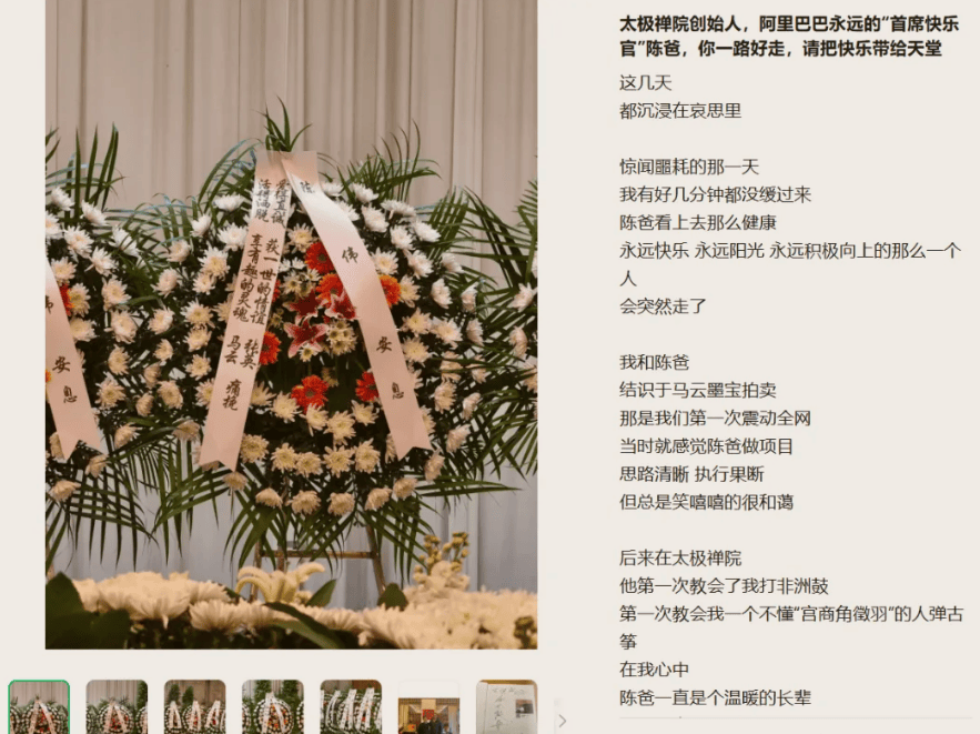 一副挽联,三十载情谊,阿里巴巴创始人马云夫妇献给相伴15年老助理陈伟的花圈上,写着"活得洒脱,享有趣的灵魂"。 出品|网经社 作者|可乐 审稿|云马 一、马云前助理陈伟去世 1月14日,"某阿里系电商大V"在微信公众号上透露,马云前助理陈伟去世。文章提到,他与陈伟在马云墨宝拍卖会上相识,并在太极禅院共度了一段美好 的时光。 1992年,杭州英语俱乐部夜校,一位名叫陈伟的年轻人与当时还是英语教师的马云相遇了。谁也没想到,这场看似普通的相识,会开启一段跨越三十多年的 情谊。 (网经社注:图片采集自网络) 马云夫妇献的花圈挽联上写着:"爱得真诚,获一世的情谊;活得洒脱,享有趣的灵魂"。阿里巴巴集团、阿里巴巴CEO吴泳铭、导演张纪中等也献了花圈。 (网经社注:图片采集自网络) 二、十五年助理生涯 (网经社注:图片采集自网络) 那时的马云,还没有创立阿里巴巴,只是一名普通的英语教师。三年后的1995年,当马云开始创业、英语俱乐部解散时,两人之间的联系却没有中断。 2005年8月,陈伟曾担任张纪中的助理兼剧组制片,参与《碧血剑》《鹿鼎记》《大唐游侠传》等电视剧的制作。 2008年4月,陈伟正式加入阿里巴巴集团,成为马云的 ...