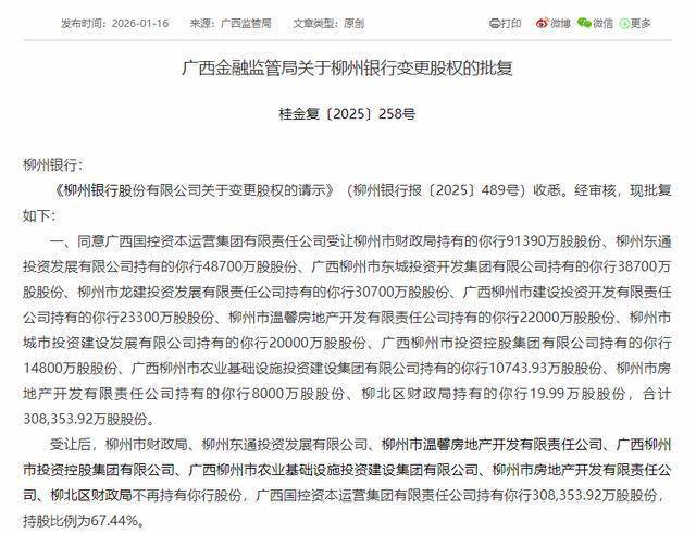 柳州银行变更股权获批:广西国控受让67.44%股权,董事长谢斌59岁