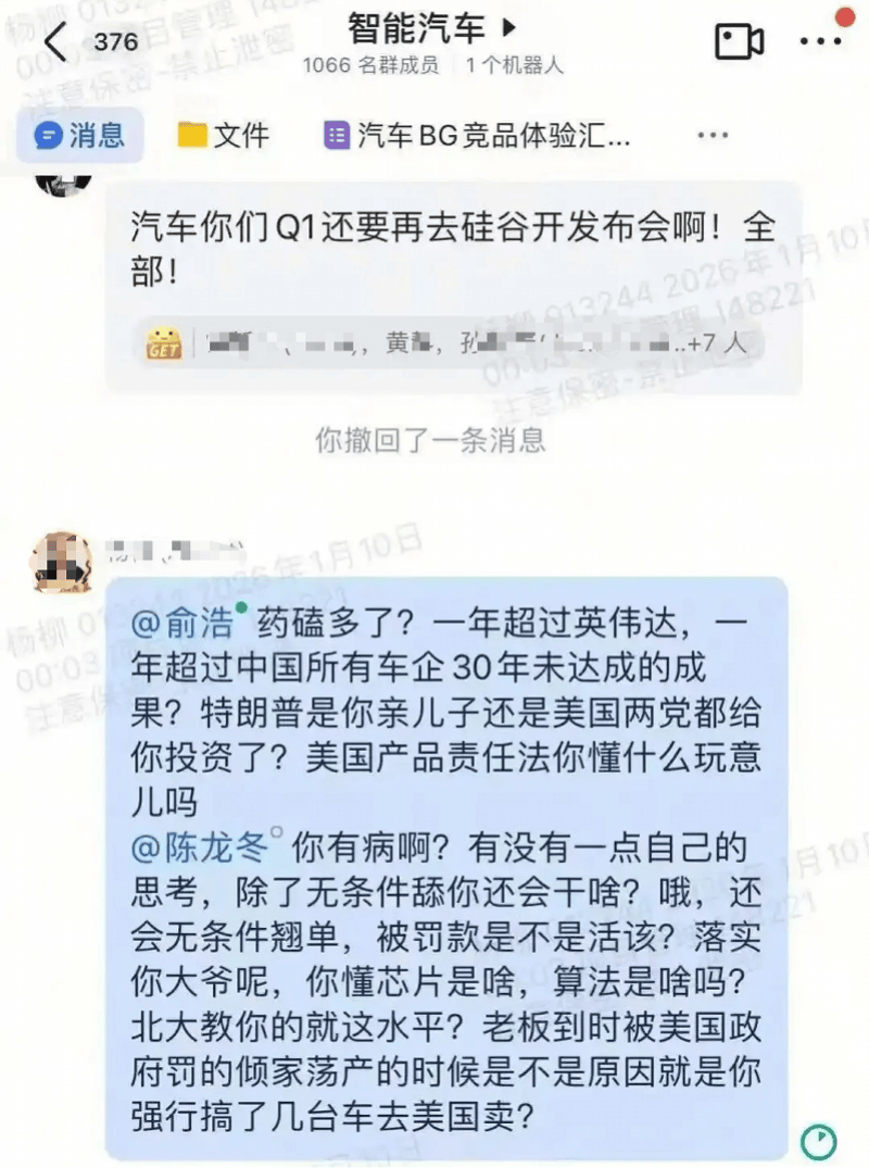 1月15日,网传员工怒怼追觅CEO俞浩,一张火药味十足的微信群聊截图在网络流传引发热议。 网传截图显示,在追觅科技一个千人工作群内,有员工公开圈出创始人兼CEO俞浩,对其近期提出的战略目标进行言辞激烈的反驳。 反驳的内容主要针对此前网传俞浩朋友圈的截图,其宣称"追觅生态将成为人类历史上第一个百万亿美金的公司生态",该员工直斥"药嗑多了?一年超过英 伟达,一年超过中国所有车企30年未达成成果?",并尖锐质问公司高层是否了解美国法律。 对此,南都湾财社记者联系追觅方面,截至发稿暂未获回应。这场疑似"贴脸开大"的内部冲突,将这家明星独角兽企业的内部管理问题暴露于公众视野,更 引发了外界对追觅近期"无边界扩张"战略可行性的拷问。 激进言论引争议,员工质疑战略合理性 "一年超过英伟达,一年超过中国所有车企30年未达成的成果?美国产品责任法你懂什么玩意儿吗?"该员工在群内直接@俞浩,发出一连串反问。据网传截 图显示,在拥有1066名成员的工作群中,该员工的情绪似乎被某些激进的业务指令引爆。 此外,截图显示,该员工还将矛头对准了群内另一位高管@陈龙冬,指责其缺乏独立思考、盲目执行,并警告这种激进策略可能带来的后果:"老板到 ...