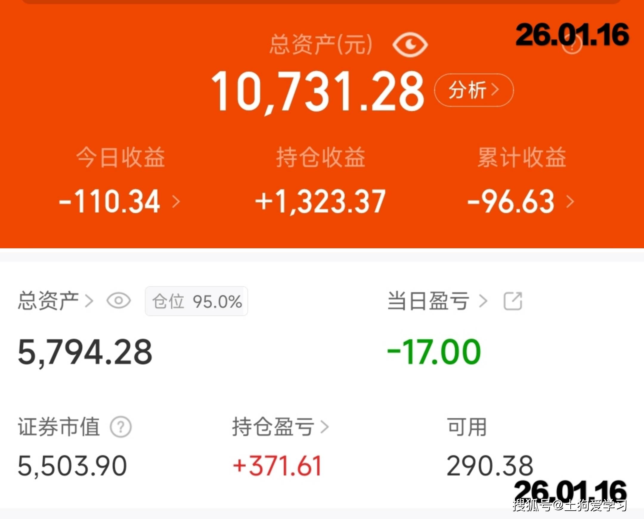 26.01.16 基金亏损127元~ 场外买入200元。 场内亏损17元;场外亏损110元。 5,503.90 +371.61 26.01.16 总资产(元) € > 10,731.28 分析> 持仓收益 今日收益 累计收益 -110.34 > > +1,323.37 = 96.63 > 搜狐号@土狗爱学习 总资产 > ◎ 合位 95.0% 当日盈亏 > CG 5,794.28 -17.00 证券市值 2 持仓盈亏 > 可用 +371.61 5.503.90 290.38 Ble State ...