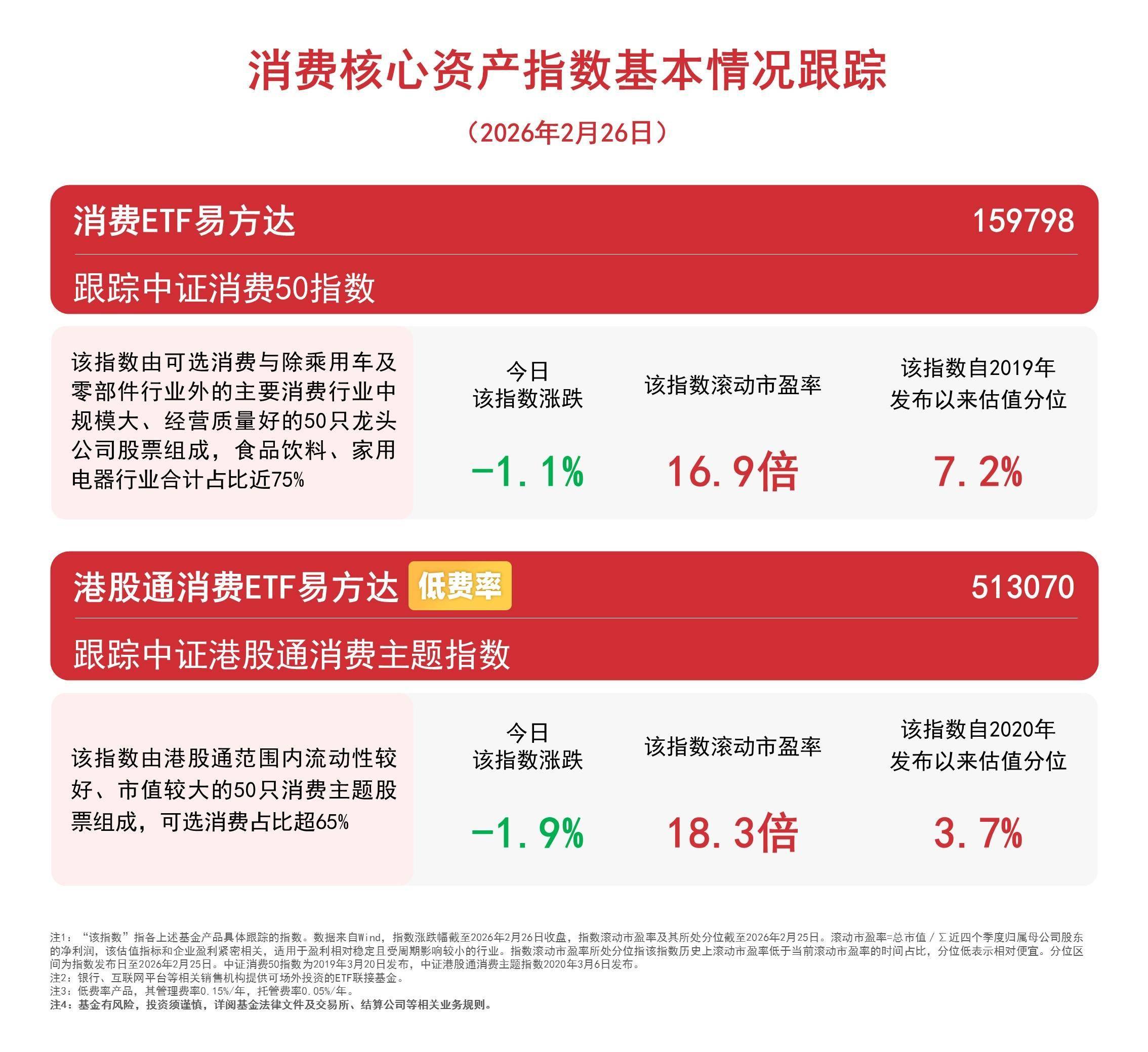 消费板块走弱,关注港股通消费ETF易方达(513070)、消费ETF易方达(159798)等产品投资机会
