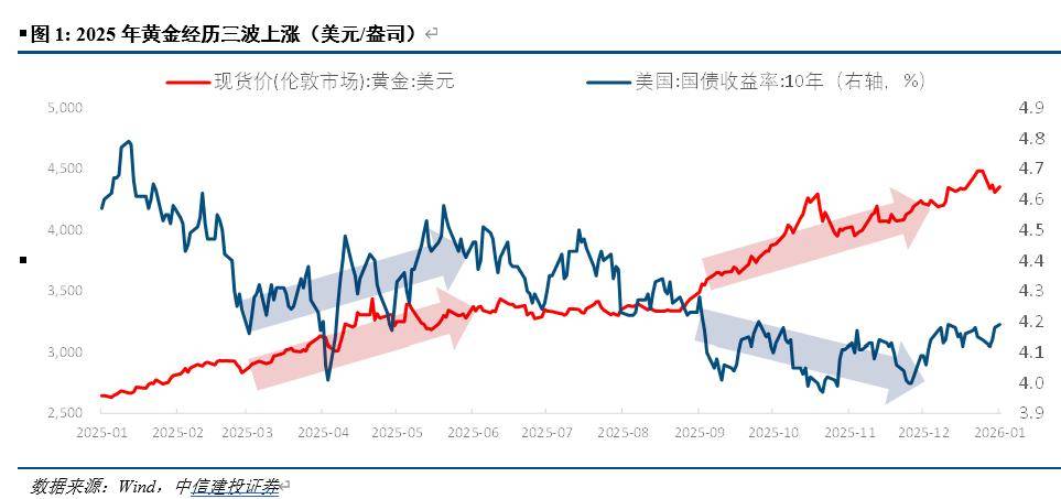 核心观点 2022年俄乌冲突金融制裁,市场意识到美元基础——国际金融秩序可被美国随意修改,所以黄金飙涨,具备跨境交易便利性的比特币也飙 涨。 2025年世纪性关税博弈落地,市场认识到金融秩序基础——经贸秩序可被美国亲自掀翻,所以黄金飙涨,代表美国信用的美债美元一度同 跌。 未来市场将见证构筑美元潮汐循环的基础之一——科技吸引力,不再美国一枝独秀。届时美元循环持续性将受质疑,黄金仍涨,这是黄金看 涨的中期逻辑。 展望短期, 2026年大概率美国AI持续,全球经历资本开支增扩的短暂繁荣,铜金将完成教科书般完美接力,2026年金价或弱于2025年,值得 期待的是铜。 直到新秩序框架明朗,新的强势国际货币走向台前,届时黄金的"黄金"时代迎来真正句号,这是黄金的长期逻辑。 摘要 去年全球大类里面表现最好的资产是贵金属,尤其是银。年末白银巨幅震荡,虽说背后有逼仓的交易行为干扰,但市场对2026年贵金属的走 势开始有了新的思考和讨论。 2025年是贵金属飙涨大年;2026年还依然是金银贵金属"狂舞"的大年么? 我们知道2022年之后黄金为代表的贵金属,经历的行情堪比1970s。本轮黄金上涨一再创新高,也一再打破传统框架预测 ...
