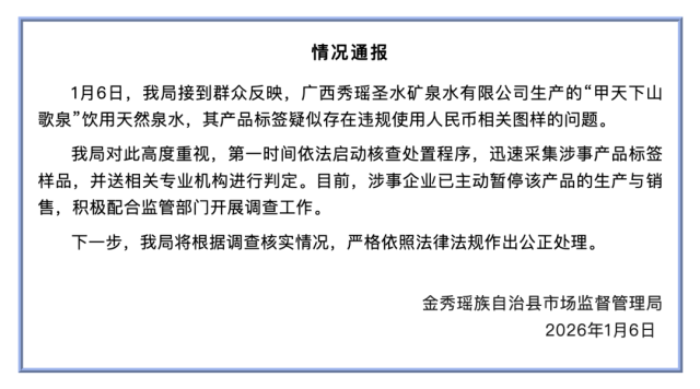 下一步,我局将根据调查核实情况,严格依照法律法规作出公正处理。 广西金秀瑶族自治县市场监督管理局1月6日通报: 1月6日,我局接到群众反映,广西秀瑶圣水矿泉水有限公司生产的"甲天下山歌泉"饮用天然泉水,其产 品标签疑似存在违规使用人民币相关图样的问题。 我局对此高度重视,第一时间依法启动核查处置程序,迅速采集涉事产品标签样品,并送相关专业机构 进行判定。目前,涉事企业已主动暂停该产品的生产与销售,积极配合监管部门开展调查工作。 记者对比发现,标签上的山水图案在细节上有所修改,如山峰位置有所调整,同时水波纹也进行了缩 减。 该矿泉水商品条码信息显示,该产品由广西秀瑶圣水矿泉水有限公司注册。该公司成立于2012年,位于 广西壮族自治区来宾市,主要从事酒、饮料和精制茶制造业。 此前报道 近日,有网友在社交媒体发帖称,广西某矿泉水包装标签上印有与20元人民币背面高度相似的图案,质 疑企业违规使用人民币图样。 图片显示,一张名为"广西地方名品""甲天下山歌泉"的矿泉水标签下部,印有与第五套人民币20元纸币 背面高度相似的桂林山水图案,并在图案左下角标注"20"字样。该图案采用具有凹凸反光质感,印刷工 艺讲究。 发帖网友 ...
