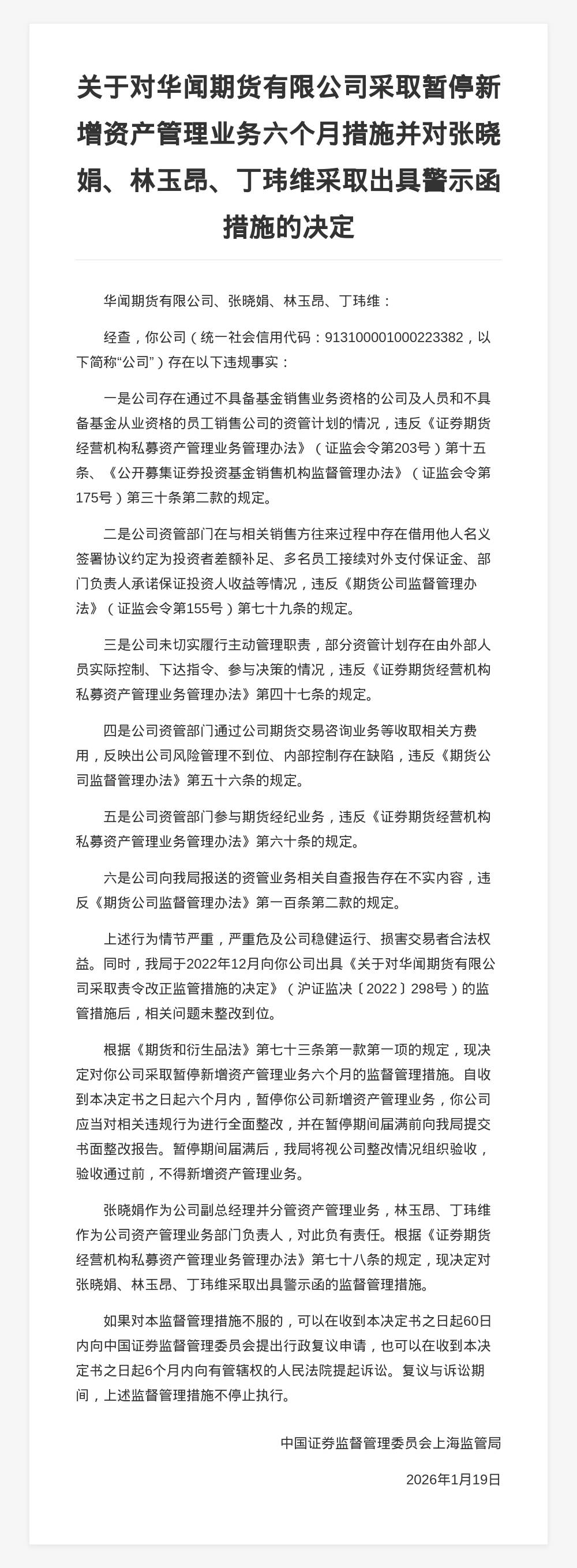 华闻期货被暂停新增资管业务六个月,涉承诺收益等多项违规