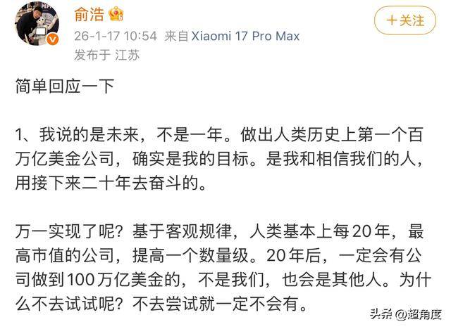 近日,追觅员工在群里怒怼CEO俞浩引发热议。 今日,俞浩发文回应称,做出一百亿美金公司说的是未来,不是一年。过去也"吹过很多牛",但是绝大 多数都实现了。 万一实现了呢?基于客观规律,人类基本上每20年,最高市值的公司,提高一个数量级。20年后,一定 会有公司做到100万亿美金的,不是我们,也会是其他人。为什么不去试试呢?不去尝试就一定不会 有。 把人类生产力提高一百倍,是我们的目标。追觅的使命:用科技推动人类社会与文明的进步!从成立至 今,从未改变过。 2、无论有没有实现这个目标,对所有人都是好事。对大家来说,多了一个观察的样本,这在今天的大 环境下也是很难得的。如果我们成功了,赚到钱了,也会慷慨地回报社会。我们从成立至今,公益和慈 善就没有停止过。已经帮助了四万个孩子们走出去看见更大的世界。我们纳税,含一线工人,今天追觅 有近四万名员工,其中研发管理有一万八千多人。我们解决了很多就业。今年我们也做到了几百亿收 入。无论能够实现最高的目标,哪怕实现到中途,对大家都是好事啊。 3、我们过去也"吹过很多牛",但是绝大多数都实现了。我们进入高速电机领域的时候,中国普遍两万 转,戴森十万转。现在,我们已经做到了20 ...