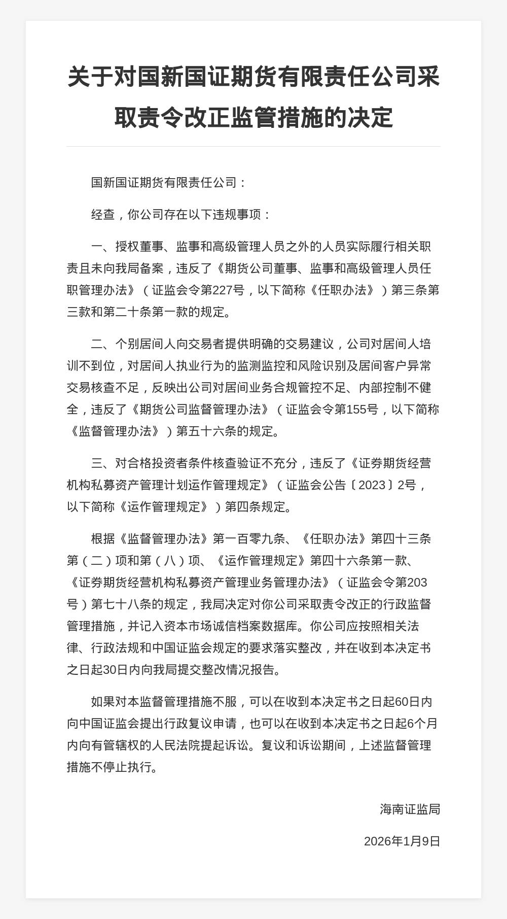 蓝鲸新闻1月17日讯,近日,海南证监局发布行政监管措施决定书,剑指国新国证期货有限责任公司。 决定书显示,国新国证期货有限责任公司存在以下违规事项:授权董事、监事和高级管理人员之外的人员实际履行相关职责且未备案;个别居 间人向交易者提供明确的交易建议,公司对居间人培训不到位,对居间人执业行为的监测监控和风险识别及居间客户异常交易核查不足,反映 出公司对居间业务合规管控不足、内部控制不健全;对合格投资者条件核查验证不充分。 以上行为违反了《期货公司董事、监事和高级管理人员任职管理办法》《期货公司监督管理办法》《证券期货经营机构私募资产管理计划运作 管理规定》的规定。 对此,海南证监局决定对国新国证期货有限责任公司采取责令改正的行政监督管理措施,并记入资本市场诚信档案数据库。 律、行政法规和中国证监会规定的要求落实整改,并在收到本决定书 之日起30日内向我局提交整改情况报告。 如果对本监督管理措施不服,可以在收到本决定书之日起60日内 向中国证监会提出行政复议申请,也可以在收到本决定书之日起6个月 内向有管辖权的人民法院提起诉讼。复议和诉讼期间,上述监督管理 措施不停止执行。 海南证监局 2026年1月9日 an ...