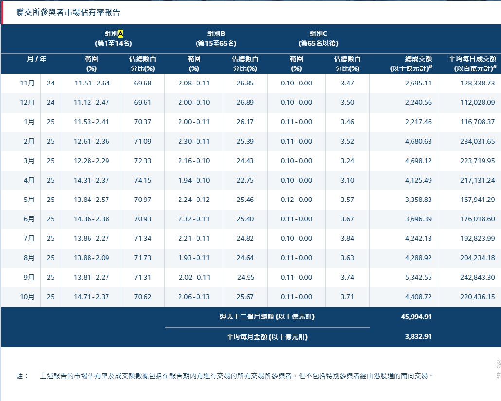 港交所参与者市场占有率报告:10月C组市占率按月跌至3.71%