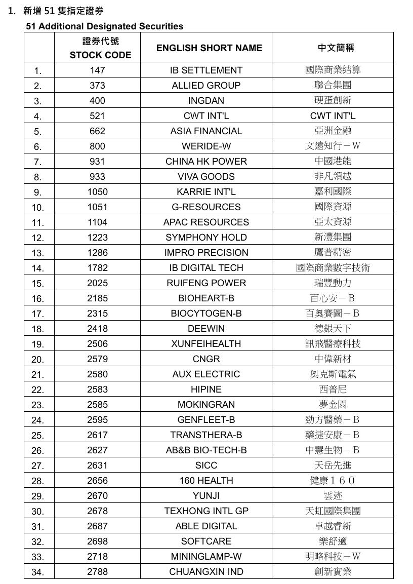 港交所于2月10日修订了认可沽空指定证券名单,具体调整将于今日生效。根据港交所最新公告,国际商业结算 (00147)、联合集团(00373)、硬蛋创新(00400)、亚洲金融(00662)、中国港能(00931)、非凡领越(00933)、嘉利国际 (01050)、劲方医药(02595)、西普尼(02583)等51家公司加入新一期可进行卖空的指定证券名单。 远东发展(00035)、思派健康(00314)、金地商置(00535)、傲基股份(02519)、广联科技控股(02531)、数字王国(00547)、 浙江世宝(002703)(01057)、狮腾控股(02562)、威海银行(09677)、富力地产(02777)等31只股票从新一期可进行卖空的 指定证券名单中删除。 具体名单如下: (1)最新空池加入名单 1. 新增 51 隻指定證券 51 Additional Designated Securities | | 證券代號 STOCK CODE | ENGLISH SHORT NAME | 中文簡稱 | | --- | --- | --- | --- | | 1. | 147 | IB SETTLEMENT | ...