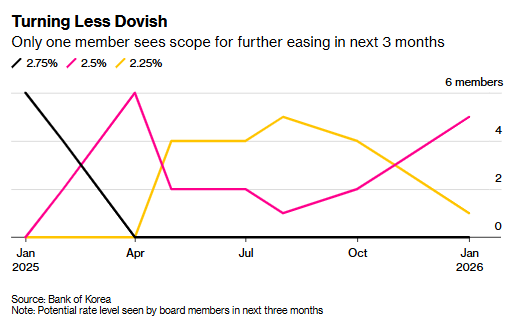 由于通胀压力温和且芯片出口保持稳定,韩国央行本周预计将维持基准利率不变,为政策制定者留出空 间,以评估与房地产市场过热相关的金融稳定风险。 一项调查显示,22位经济学家一致预测,韩国央行将在周四维持7天回购利率在2.5%不变。在1月的会 议上,政策委员一致决定维持利率不变,并删除了此前暗示可能进一步降息的措辞,标志着政策立场转 向中性。 央行此次还将发布最新的经济增长和通胀预测。强劲的半导体出口数据支撑了经济学家的预期,即央行 可能将2026年GDP增长预测从1.8%上调至2%。同时,通胀预测预计将维持在央行2%的目标附近。 法国巴黎银行经济学家Jeeho Yoon在报告中指出:"我们认为,韩国央行的政策声明将'基调平衡',同时 提示增长和通胀的上行风险。目前没有看到央行调整政策利率的迫切必要性。" 然而,除芯片产业外,其他领域增长动力不足。国内需求依然疲软,外部风险持续存在。 美国最高法院上周否决特朗普政府的对等关税政策后,美国贸易政策的不确定性再度浮现。尽管韩国表 示与美国达成的贸易协定仍然有效,但美国政府正准备根据《1962年贸易扩展法》第232条款启动一系 列新的国家安全调查,这将为特朗普实施新关税铺 ...