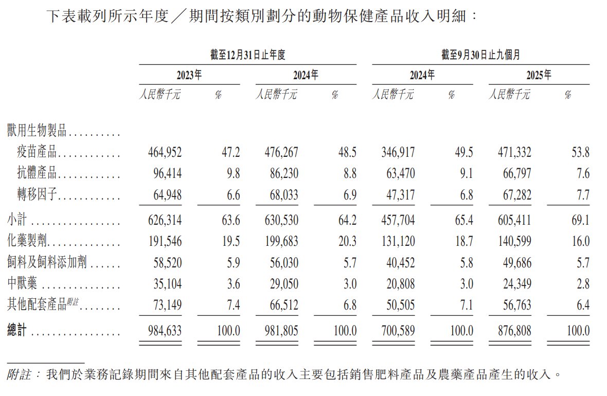 动物保健行业头部企业,中国禽用兽用生物制品排名第三的供应商,2025年收入利润双增的信得科技赴港上市。 | | | 截至12月31日止年度 | | | | 截至9月30日止九個月 | | | --- | --- | --- | --- | --- | --- | --- | --- | | | 2023年 | | 2024年 | | 2024年 | | 2025年 | | | 人民幣千元 | % - | 人民幣千元 | % | 人民幣千元 | 6 | 人民幣千元 | | 獸用生物製品 | | | | | | | | | 疫苗產品 | 464.952 | 47.2 | 476.267 | 48.5 | 346.917 | 49.5 | 471.332 | | 抗體產品 | 96,414 | 9.8 | 86,230 | 8.8 | 63,470 | 9.1 | 66,797 | | 轉移因子 | 64.948 | 6.6 | 68,033 | 6.9 | 47.317 | 6.8 | 67.282 | | 小計 | 626.314 | 63.6 | 630.530 | 64.2 | 457.704 | 65.4 ...