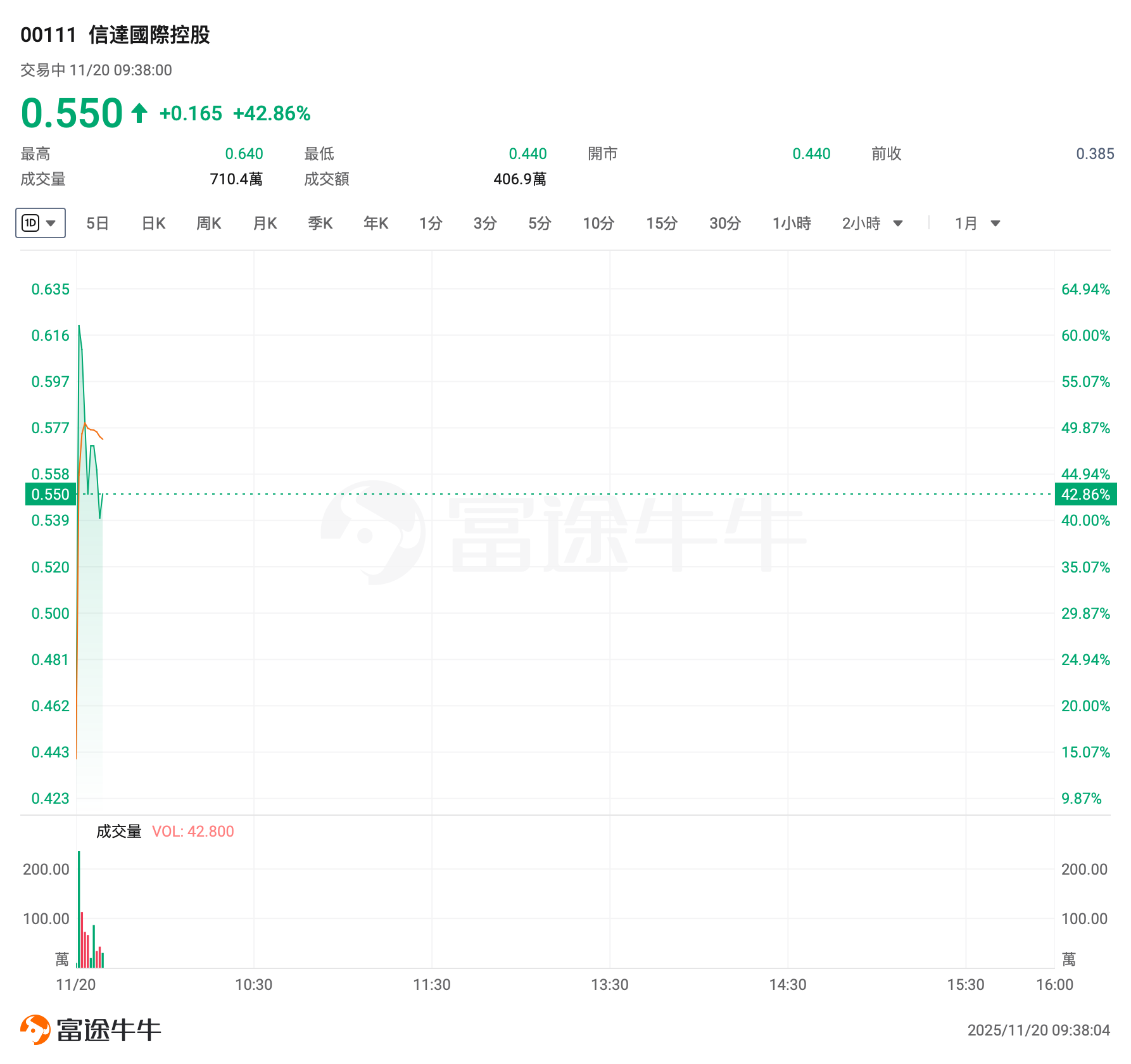 汇金系再有大动作。截至发稿, 涨超40%, 涨超6%。 | | | / 消息面上,中金公司与东兴证券、信达证券同步发布公告,宣布正在筹划由中金公司通过换股方式吸收合并这两家公司。根据三季报,中央汇金通过中国信 达间接持有信达证券78.67%股权;通过东方资产间接持有东兴证券45.14%股权。而中央汇金也是中金公司的实控人,直接持有中金公司40.11%股权。 I U:SU I I : I S.SU 9 富途牛牛 01359 中國信達 交易中 11/20 09:38:39 1.340 + +0.100 +8.06% | 最高 | | | 1.370 | | 를従 | | | 1.290 | | 開市 | | | --- | --- | --- | --- | --- | --- | --- | --- | --- | --- | --- | --- | | 成交量 | | | 1.72億 | | 成交額 | | | 2.27億 | | | | | ID) ▲ | ミ目 | 日K | 園K | 月K | 愛K | 年K | 1分 | 3分 | 5分 | 10分 | 15分 | | 1.344 | | | | | | ...