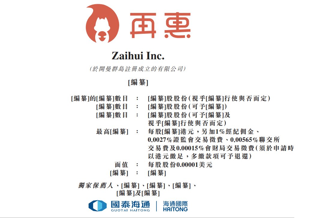 据港交所2月13日披露,Zaihui Inc.(简称:再惠)向港交所主板递交上市申请,国泰海通为其独家保荐人。招股书显 示,再惠是中国最大的餐饮线上运营与营销解决方案提供商。作为AI优先解决方案的提供商,再惠助力本地商家管 理、营销及获利。全栈模式将策略与执行无缝整合,提供覆盖门店诊断、自动化运营建议及精准流量获取的全方位解 决方案。再惠以AI优先为战略,将智能工具直接嵌入内部营运流程,使能够处理大量多平台数据,实现自主、高质量 的执行,并根据商家的需求进行扩展。 | 编纂]的编纂]數目 | :「編纂]股股份(視乎[編纂]行使與否而定) | | --- | --- | | [编纂]數目 | : [编纂]股股份(可予隔纂]) | | [编纂]數目 | : [編纂]股股份(可予編纂]及 | | 視乎編纂 行使與否而定) | | | 最高 编纂] : | 每股[編纂]港元,另加1%經紀佣金、 | | 0.0027%證監會交易徵費、0.00565%聯交所 | | | 交易費及0.00015%會財局交易徵費(須於申請時 | | | 以港元繳足,多繳款項可予退還) | | | 面值 : | 每股股份0.00001美元 | ...