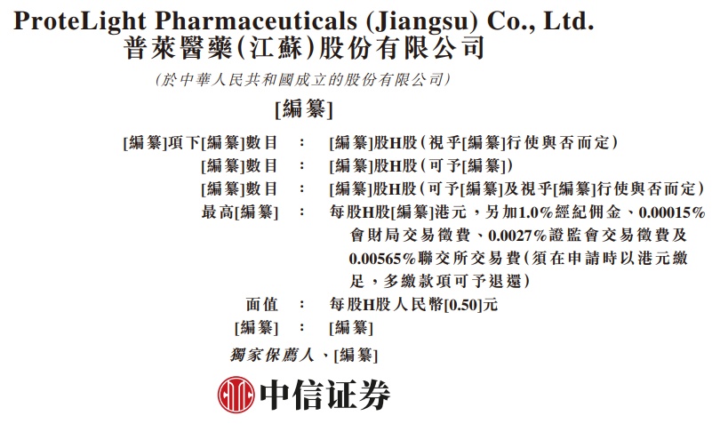 据港交所2月13日披露,普莱医药(江苏)股份有限公司(简称:普莱医药)向港交所主板递交上市申请,中信证券为其 独家保荐人。招股书显示,普莱医药是一家于2009年4月成立的领先创新型抗菌肽(AMP)治疗药物公司,专注于四 个核心治疗领域,即抗感染、代谢疾病、肿瘤及自身免疫疾病,致力于通过公司的专有突破性技术及候选药物解决 全球重大未被满足的健康需求。截至最后实际可行日期,普莱医药有九种候选药物,包括一种核心产品(即PL-5)及 两种主要产品(即PL-3301及PL-18)。 ProteLight Pharmaceuticals (Jiangsu) Co., Ltd. 普萊醫藥(江蘇)股份有限公司 (於中華人民共和國成立的股份有限公司) [編纂] 獨家保薦人、[编纂] [编纂]股H股(視乎[编纂]行使與否而定) [编纂]項下[编纂]數目 .. [编纂]數目 : [编纂]股H股(可予[编纂]) 「编纂]股H股(可予[编纂]及視乎[编纂]行使與否而定) [编纂]數目 : 最高[编纂] 每股H股[編纂]港元,另加1.0%經紀佣金、0.00015% : 會財局交易徵費、0.0027%證監會交易徵費及 0.00565%聯交 ...