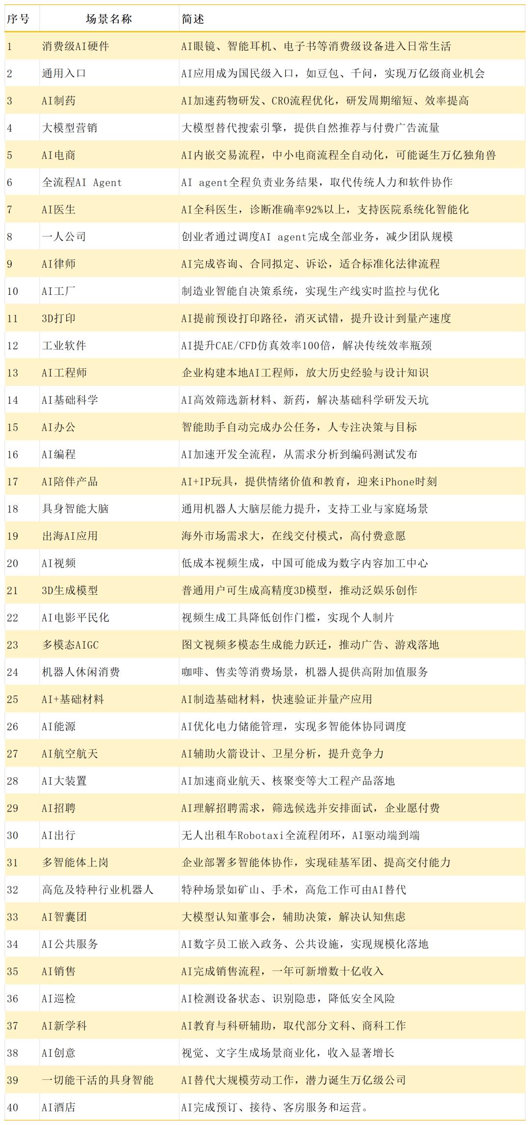 2026年开年,全球最重要的经济年会达沃斯论坛上,参会者只关心两件事:AI和美国总统川普。 关心川普,是因为担心他会不会真的吞并格陵兰,从而彻底改变战后建立的西方秩序。 对AI的讨论则聚焦在一个点:投入能否转化为绩效,也就是有没有落地场景。 最近,为了找出2026年最佳AI场景,铅笔道访谈了100投资人、创业者,一些共识正在浮现—— AI 的落地,会优先出现在那些需求刚性、流程清晰、价值可量化的地方。 基于这些一线判断,本文系统梳理了2026 年最有可能跑出来的40个AI应用场景——它们有的已经开始产生收入,有的正在跨过关键拐点,也有的正在重 塑一个行业的底层逻辑。 本文场景目录如下: | 序号 | 场景名称 | 简述 | | --- | --- | --- | | 1 | 消费级AI硬件 | AI眼镜、智能耳机、电子书等消费级设备进入日常生活 | | 2 | 通用入口 | AI应用成为国民级入口,如豆包、千问,实现万亿级商业机会 | | 3 | AI制药 | AI加速药物研发、CRO流程优化,研发周期缩短、效率提高 | | 4 | 大模型营销 | 大模型替代搜索引擎,提供自然推荐与付费广告流量 | | 5 ...