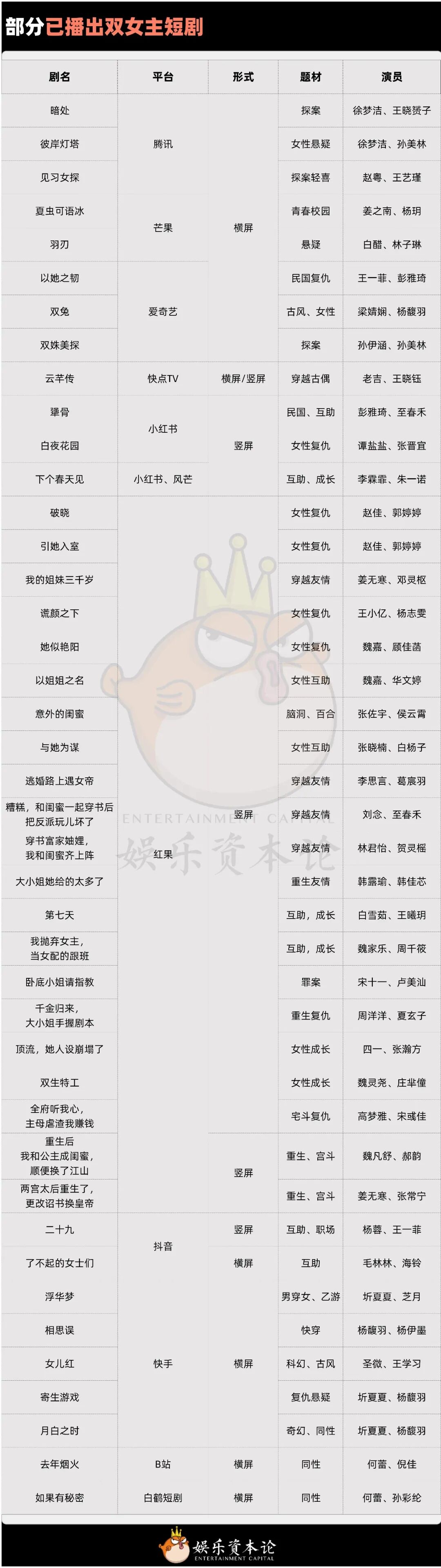 在不少女性主义者看来,春节档电影"含男量"依旧不低:《飞驰人生3》是几乎清一色的男性阵容,《镖人》是传统武侠气质主导的男性叙事。 但今年春节档数据异常好的"短国",风向却悄然不同。 春节前后的短剧榜单里,女性群像剧频频霸榜,题材已经从"大女主"跨越到"双女主"。《糟糕,和闺蜜一起穿书后把反派玩儿坏了》以双女主穿书轻喜剧 突破红果1.2亿热度值,《白夜花园》用悬疑结构包裹女性纠缠与互助,《双姝美探》则将两位女性放入民国探案框架。 在主旋律赛道里,双女主也成为切入口。春节前,法制日报社影视中心与爱奇艺、稻草熊联合发起的微短剧线上剧场品牌"法眼剧场"首部作品《罪恶拼 图》正式开机,由傅菁与戚砚笛搭档主演的双女主追凶悬疑剧一经官宣便引发讨论,"是谁家死去的CP突然攻击我""我的CP又复婚了"等评论迅速刷屏。 短国的"含女量"持续上升之余,女性叙事在短剧赛道里占据更显眼的位置。 如果说大银幕春节档仍然围绕男性叙事运转,那么在短剧赛道里,"就要看女人"的情绪已经变成一种清晰的趋势。 "双女主"正是在这样的背景下,在短剧赛道中完成了重生。 两年前,这类故事还只是长剧里的闺蜜线或工具人角色;如今,在重生复仇、大女主逆袭、豪门 ...