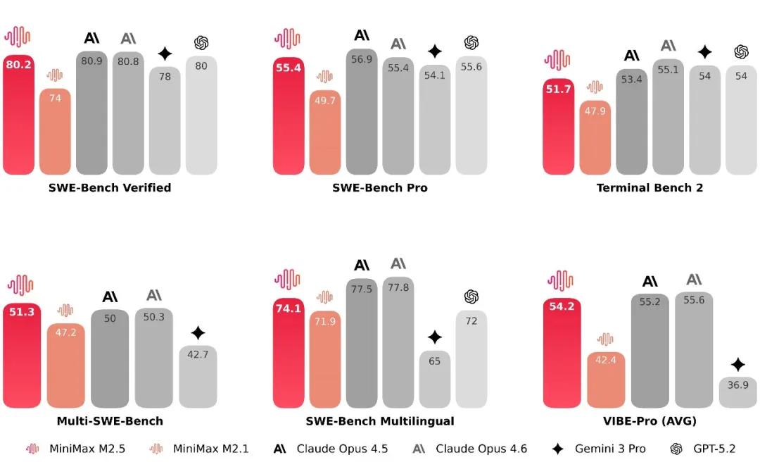 Core Insights - The M2.5 model from MiniMax has been officially launched, showcasing advanced capabilities in full-stack development and Vibe Coding, rivaling Claude Opus 4.6 in performance [1][2] - M2.5 is designed for the intelligent agent ecosystem, enabling seamless integration with frameworks like OpenClaw, allowing natural language commands to be converted into executable code [1][5] Performance Metrics - M2.5 achieved an impressive score of 80.2% on the SWE-Bench Verified leaderboard and ranked first in the Multi-SWE-Bench for multi-language tasks [2] - The model operates with 10 billion activation parameters, making it the smallest flagship model in its tier, yet it boasts a throughput of 100 TPS, double that of mainstream flagship models [9][30] Full-Stack Capabilities - M2.5 can generate complete, functional code for both front-end and back-end applications, including database design, allowing for comprehensive project delivery [4][5] - The model's "native Spec behavior" enables it to deconstruct functional structures and UI designs before coding, enhancing its logical capabilities [5][6] Automation and Efficiency - M2.5 employs a Process Reward mechanism to monitor task completion quality, particularly effective in handling long-chain tasks [5][9] - The model can automate complex tasks, such as generating structured financial reports from raw data, demonstrating its proficiency in data handling and analysis [7][18] Industry Impact - The introduction of M2.5 signals a significant advancement in AI applications, with rapid iterations in code capabilities over the past 100 days [28] - M2.5's cost-effectiveness, at just $1 per hour for continuous operation, addresses previous concerns regarding the expense and speed of AI solutions [30][33] - The model has already taken over 30% of real business operations within MiniMax, indicating its potential to enhance productivity and reduce the need for constant developer oversight [33]